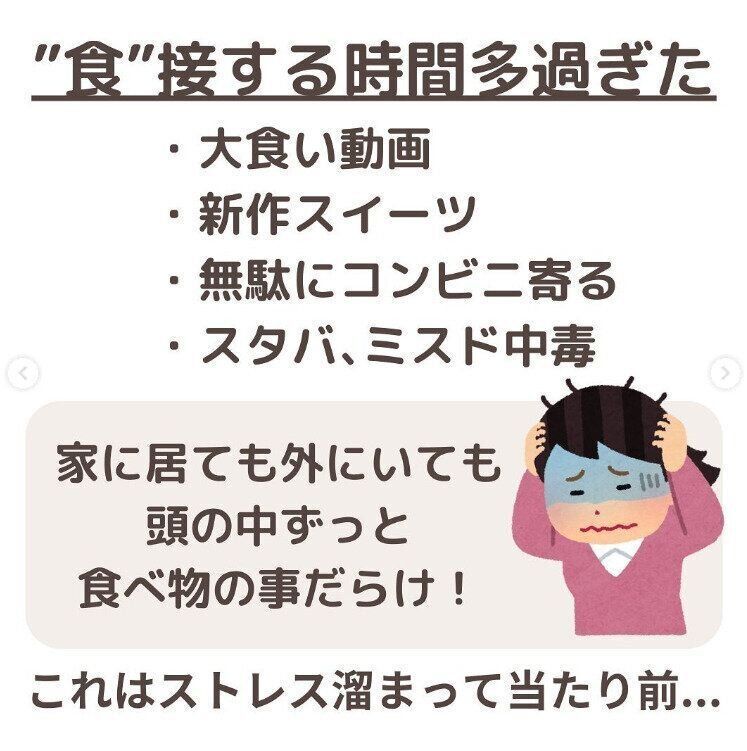 食べることが大好き!コンビニの新作スイーツをチェックしては試してみたり、毎日カフェに通ったり。常に頭の中は食べ物のことばかりだったといいます。そんな気持ちのままダイエットを始めてしまったため、低カロリーや、低糖質などをうたった商品に飛びつき、栄養バランスを考えない食事を続けたことで、ますます痩せにくい体に。しかも、好きなものを食べることができないから、ストレスでまた過食。