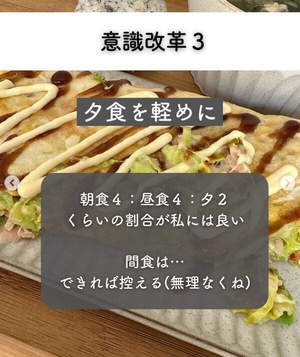 koharu_0_0さんにとっての、1日の食事量のバランスは、「朝食4:昼食4:夕食2」がベスト。間食は、無理のない範囲でできるだけ控えるようにしています。