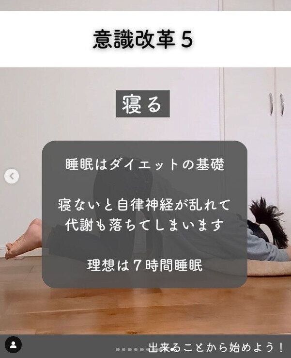 koharu_0_0さんいわく、「いきなり運動をやりすぎたり、食事を我慢しすぎたり、体に負担をかけていませんか?」といいます。まずは、意識を変えて基本的な健康習慣を身につける。それに慣れてから次のステップに進んだほうがきれいに痩せることにつながるのだとか。さあ、本格的にダイエットを始める前に、あなたの意識を改革!具体的に教えてもらいましょう。
