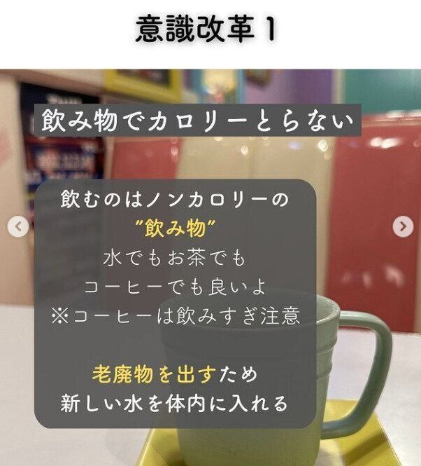 まずは、「飲み物でカロリーをとらない」こと。水でも、お茶でも、コーヒーでもOK。ただし、コーヒーは飲み過ぎに注意したほうがいいのだそう。体のなかの老廃物を出すために、新しい水を体内に入れることを意識しましょう。