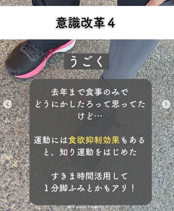 koharu_0_0さんも、食事の改善だけでダイエットをしようと思っていたそうですが、運動には食欲抑制効果もあることを知り、運動をはじめました。すき間時間を活用してこまめに動く習慣をつけたいですね。