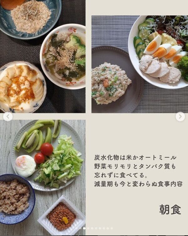 これが実際にkoharu_0_0さんが食べている朝食の様子。朝からこんなに?と驚きますよね。炭水化物もごはんかオートミールにして、しっかりと食べているのだそう。野菜もたっぷり、タンパク質も忘れずに。