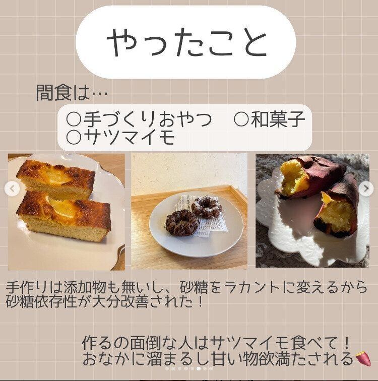 食事制限ではなく、栄養バランスのとれた食生活に改善したことで-10kgというダイエットに成功したsui_diet_さん。甘い物も、制限するのではなく、健康的に食べることができる物を選べばいいのではと考えたのです。菓子パンやチョコレート、甘いスイーツ、アイスクリームではなく、フルーツやハチミツ、手づくりのケーキ、和菓子、焼き芋などに置き換えました。甘い物を食べたいという強い気持ちもお腹も、これでしっかりと満たされているから、ダイエットも無理なく継続することができたのですね。
