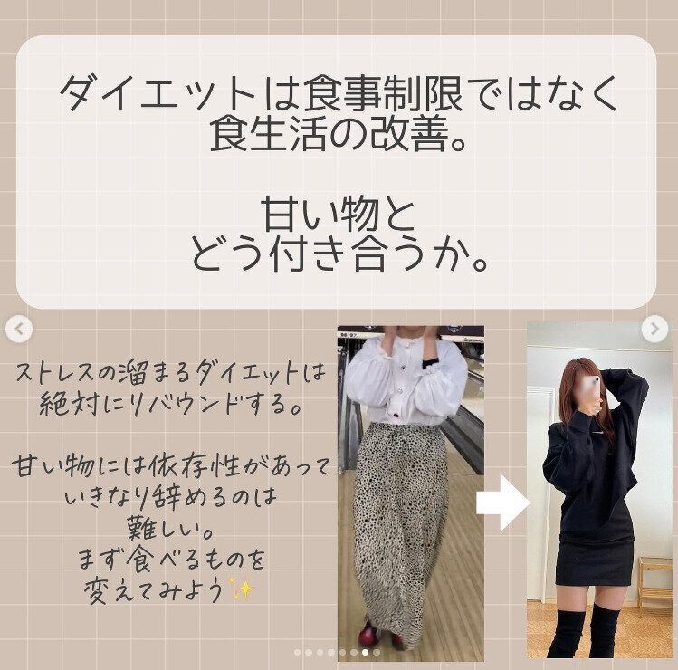 甘い物が大好きだから、「無理にやめたとしてもストレスがたまり、絶対にリバウンドする」と自己分析したsui_diet_さん。ダイエットは、食事の制限ではなく、食生活の改善であることを身をもって感じていたので、「甘い物とも賢く付き合う」と、考えかたを変えてみたのです。具体的に教えてもらいましょう。