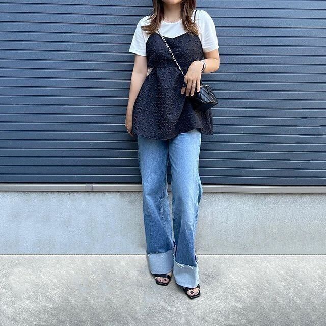 しまむらは、セット商品が多い点も紹介した他ブランドと違うところ。こちらは、白のTシャツとトレンドのふくれジャガード生地が使われたキャミソールがセット(1,969円)になってお得度大!キャミソールは、サイドがカットされているデザインがポイント。白Tシャツとセットなのでレイヤードにも悩みません。