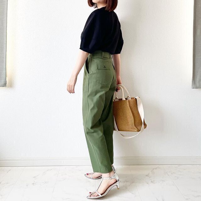 GUは、1枚でおしゃれがキマるTシャツが豊富。着用されている「ランタンスリーブT/1,490円」は、袖にボリュームのあるシルエットで、ササッと着るだけでもキュートさが伝わります。程よく厚みがありますが、身体から離れるシルエットなので暑苦しさもナシ。こちらはウエストインして着こなすと、バランスがきれいに見えますよ。