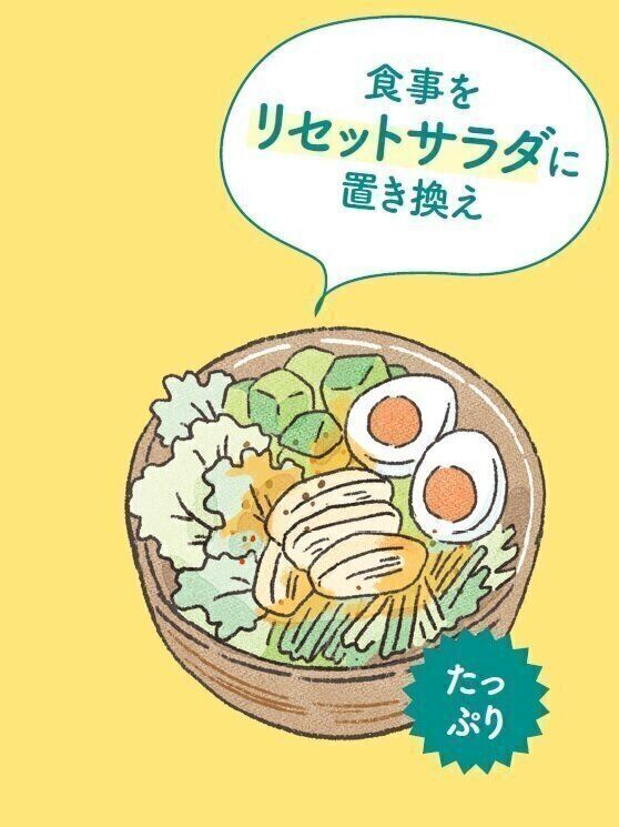 好きなだけ食べた日の次の日は3食をリセットサラダに置き換えて。ボウル1杯分たっぷり盛った野菜に、ゆで卵やチーズ、サラダチキンなどたんぱく質をドサッとトッピング。味付けはクレージーソルトとオリーブ油。しっかり栄養をとりながら食べ過ぎを調整できます。野菜はレタスやキャベツなど葉物を多めに。量は大きめのボウルに1杯分程度。