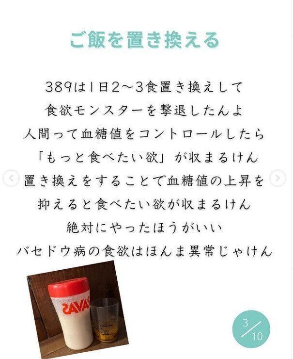 389dietさんのダイエット方法をご紹介しました。長年の持病が落ち着いたタイミングでダイエットをスタートさせた389dietさん。長い闘病でしたが、持病と向き合い、自分の体のことを見つめ続けてきたことがダイエットに大きな成果をもたらすことに。自分の体に合ったダイエットを取り入れたことで、一気にダイエットは加速したのです。389dietさんいわく、ダイエットの大切なポイントは、「成功するか失敗するかは自分に合ったダイエット方法を見つけることができるかどうか」なのです。