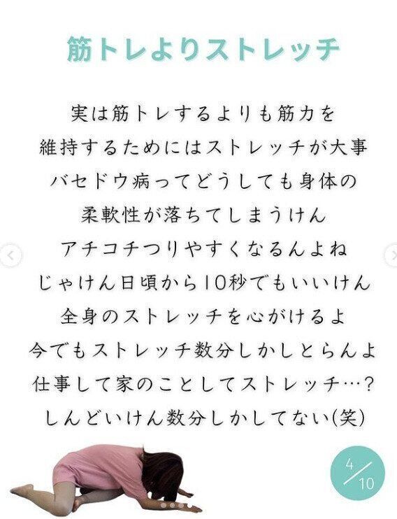 何もしないと体の柔軟性が落ちやすいことを自覚していたので、筋トレよりもストレッチを重視しました。ただ、仕事や家事をしながら、運動に長い時間をかけることはできません。自分ができる範囲で続けることを意識しました。