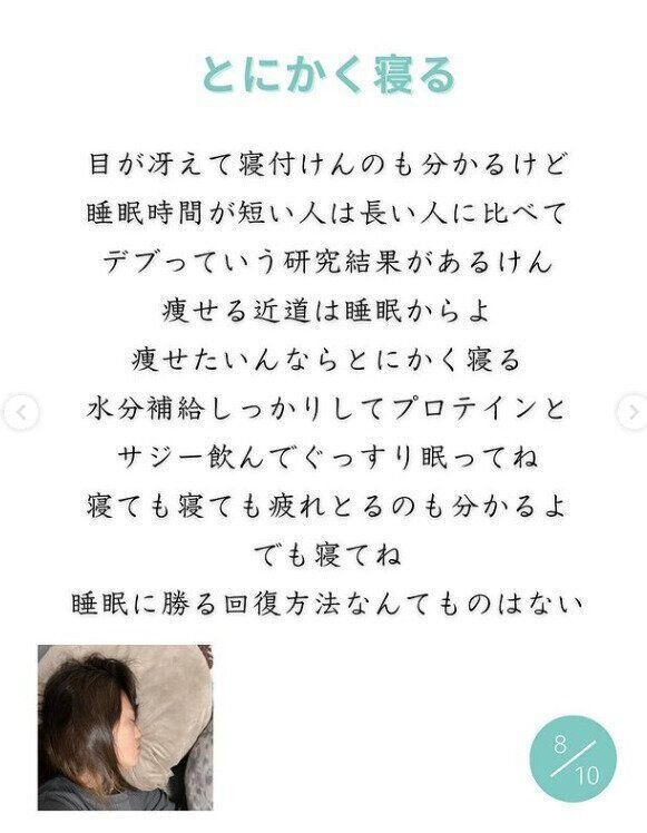 体をしっかりと休めることも大切だといいます。「痩せる近道は睡眠から!」。心と体の健康を取り戻すための大切なダイエット方法なのです。