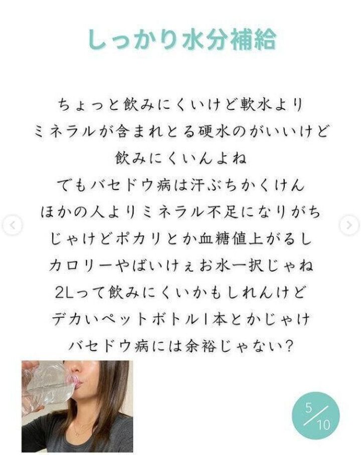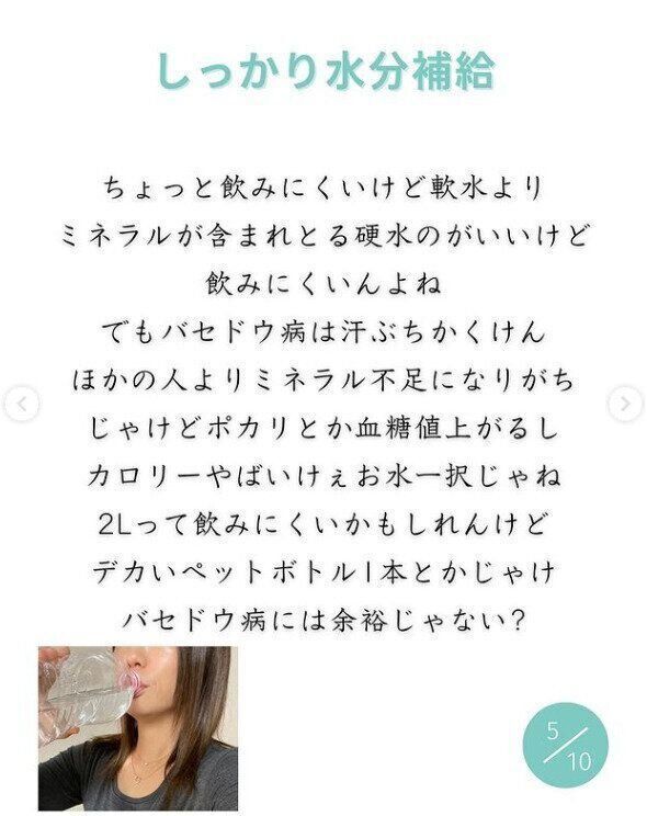 病気の影響で汗をかきやすい体ということがわかっているので、水分をしっかりととることを心がけました。味のついたスポーツドリンクなどではなく、お水を飲むことがポイントでした。