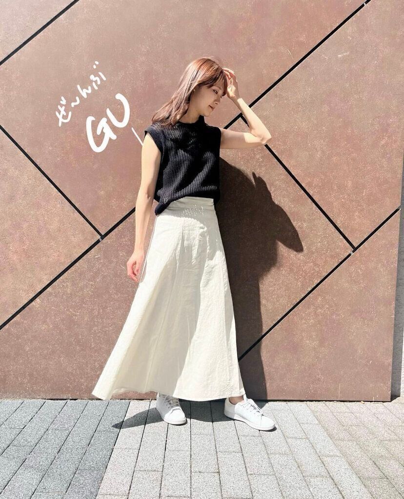「リネンブレンドフレアロングスカート」(1,990円)は大きく広がりすぎない程よいフレアシルエットが細見え!とSNSでも話題のアイテム。リネン素材とレーヨン素材をブレンドしたGUオリジナルの生地は着ている本人も心地よい軽やかな風合いが暑い日にもピッタリ。モノトーンでコーディネートを組めば、かわいらしさの中にもクールな印象を与えるハンサムコーディネートが完成します。