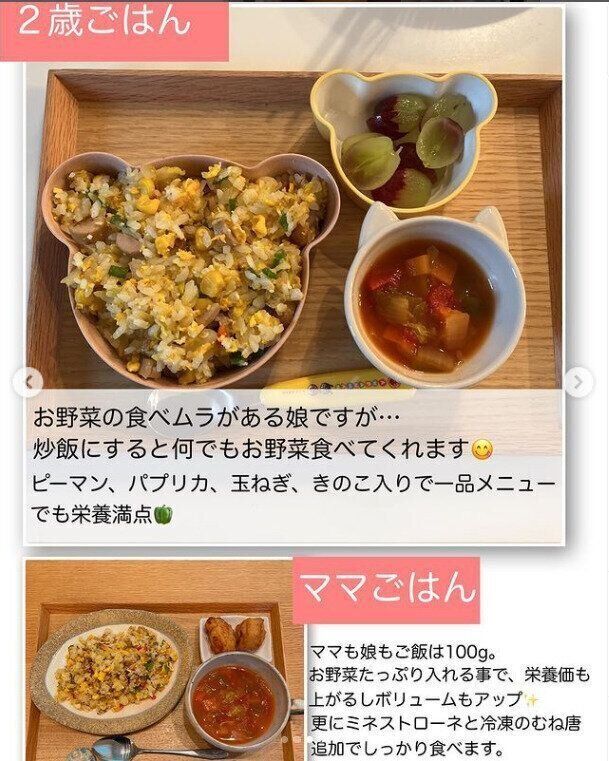 こちらの写真。子どもにはチャーハン、ミネストローネとフルーツです。チャーハンには、ピーマン、パプリカ、玉ねぎ、きのこを細かく刻んで入れているのだそう。チャーハンにすると、野菜が苦手な子どもでも食べやすいといいます。また野菜をたっぷりと入れることで、ご飯は100g程度でも、ボリューム満点。大人には冷凍のむね唐揚げを追加することで、さらにボリュームを出します。