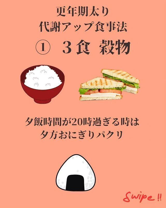 年齢を重ねた女性が代謝をアップするための方法、まずは3食、しっかりと穀物をとることです。炭水化物は太るからと抜いている人も多いですが、毎食食べることを心がけています。帰宅が20時を過ぎるときには、夕方の6時ころにおにぎりを食べて栄養補給をしています。