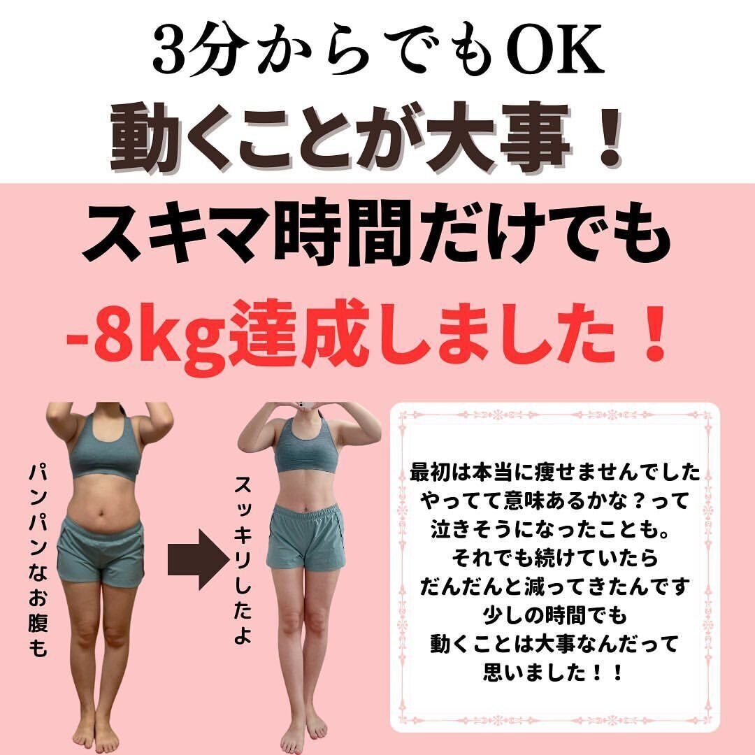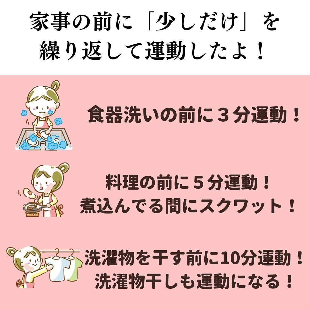 dietdiet_40さんのすき間時間とはこんな感じ。「食器を洗う前に3分間だけ運動する」「料理の前に5分間だけ運動し、煮込んでる間はスクワットをする」「洗濯ものを干す前に10分間運動し、洗濯物干しも運動にしてしまう」といったように、家事をする前と間に、少しの時間だけでも体を動かし、習慣化させていきました。