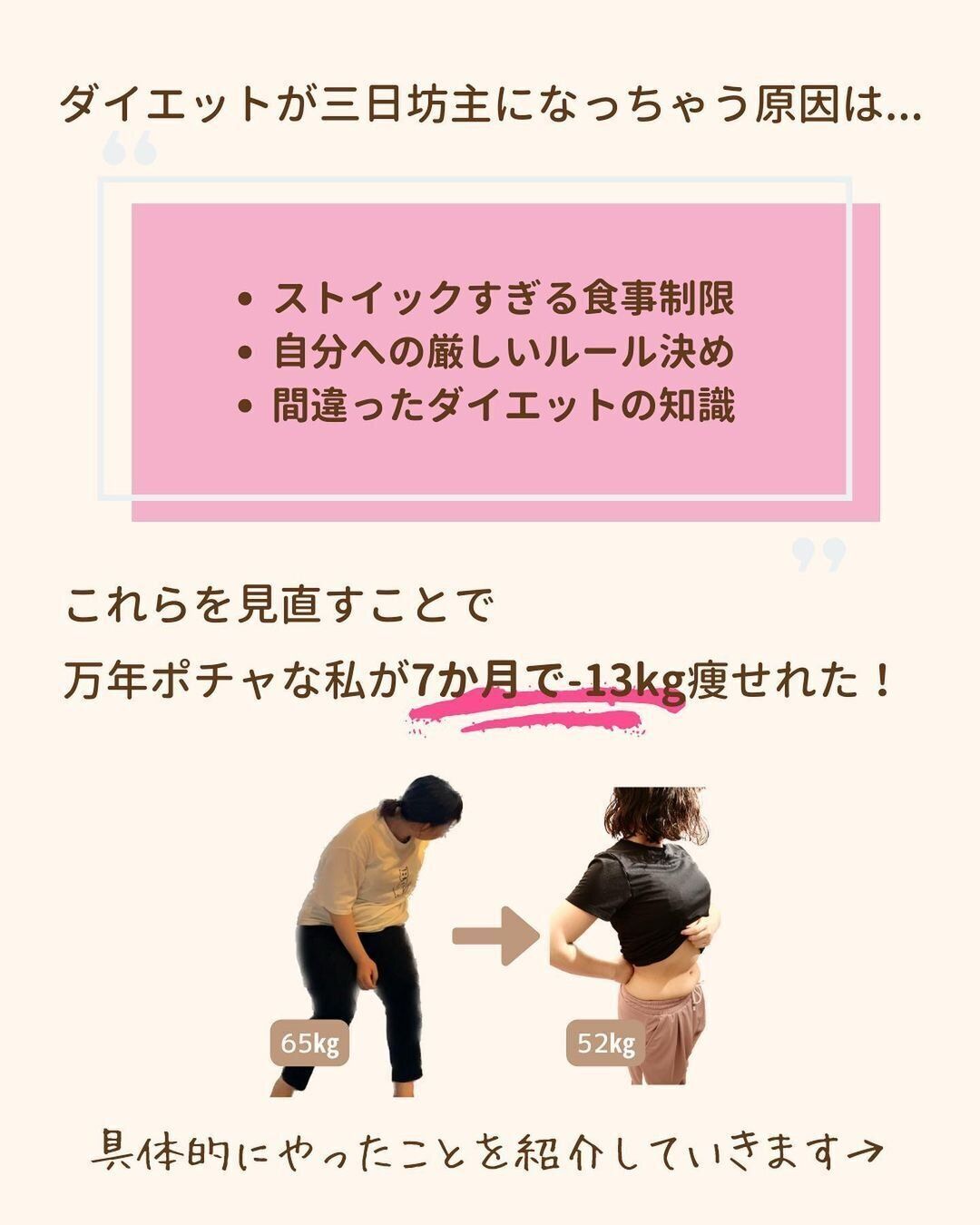 なぜ自分はダイエットをしても「三日坊主」になってしまうのか。今回こそ、ダイエットを継続して結果を出すために、sakko.dietさんは客観的に自分を見つめ直します。「ストイックすぎる食事制限」「自分への厳しいルール決め」「間違った知識」でダイエットを進めていたことが原因であると考え、方法を大きく改めることにしたのです。どんなダイエットをしているのか、具体的にみていきましょう。