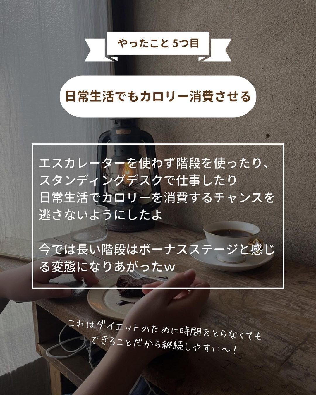 日常生活でも、カロリーを消費するチャンスを逃さないように心がけました。エスカレーターを使わずに階段を使ったり、スタンディングデスクで仕事をしたり。今では長い階段を見ると、「ボーナスステージだ」と感じられるようになったのだそうですよ!