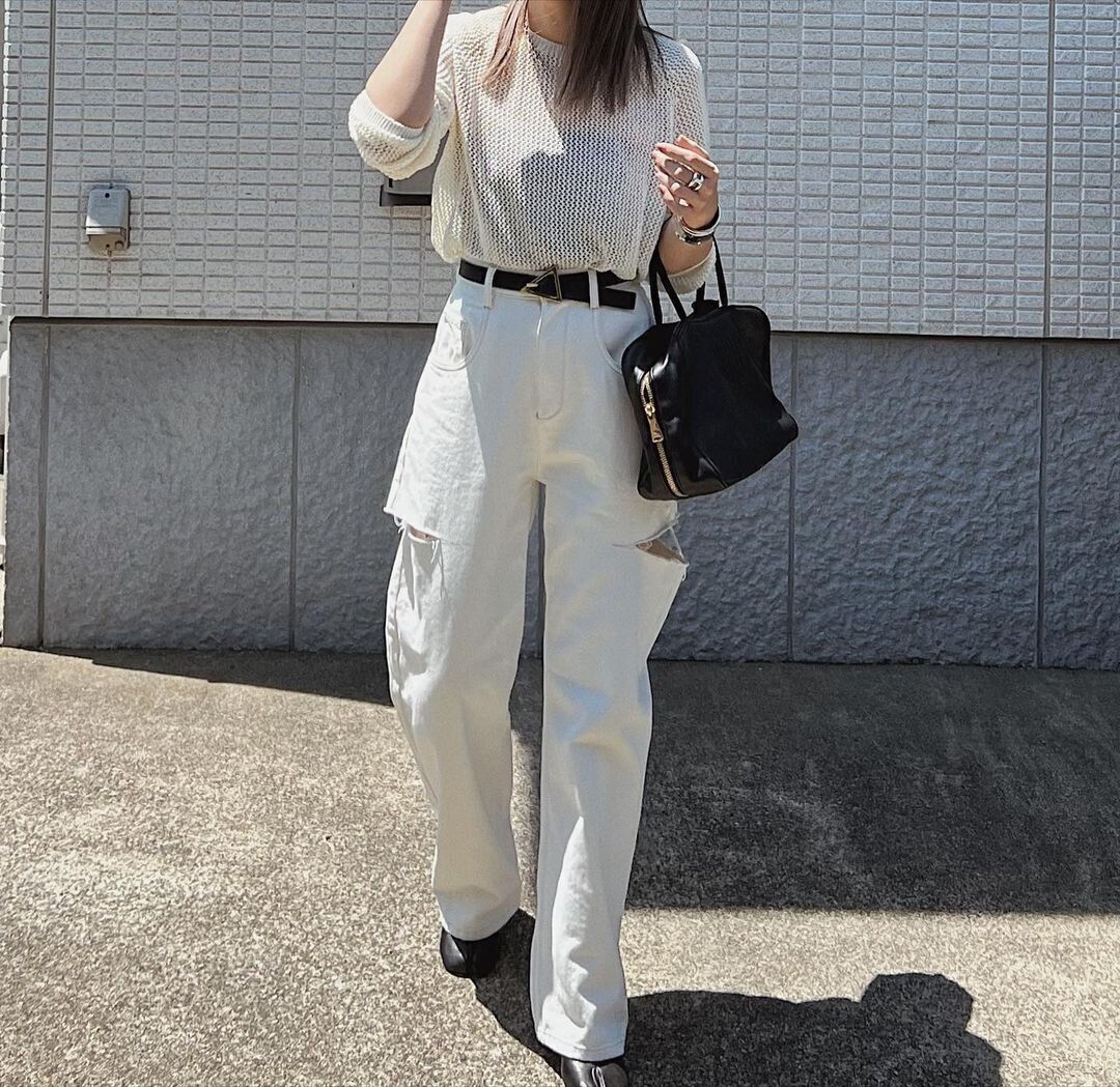 「3Dメッシュクルーネックセーター/2,990円」は、タンクトップとレイヤードしながら今すぐ着られる代表的な新作。特殊な立体編みで体に自然になじむこと、縫い目がないので、メッシュ編みがきれいに見えるので、メッシュニット初心者でも合わせやすいのが魅力です。肩かけするのにちょうどいいボリューム感も◎。