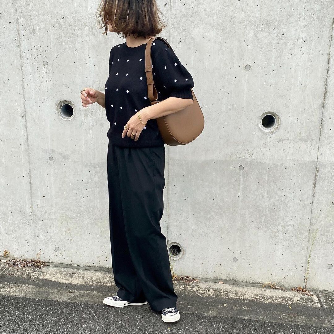 発売後、オシャレさんから人気を集めたのが「レザータッチワンハンドルバッグ/2,990円」。今年らしいシルエットなので目に留まるのも納得。さらに上質感があるのに、水や汚れも簡単に拭き取れてお手入れがラクにできてデイリー使いにぴったりなバッグ。ダークトーン×キャメルのバッグを持つとグンと秋らしい雰囲気に。