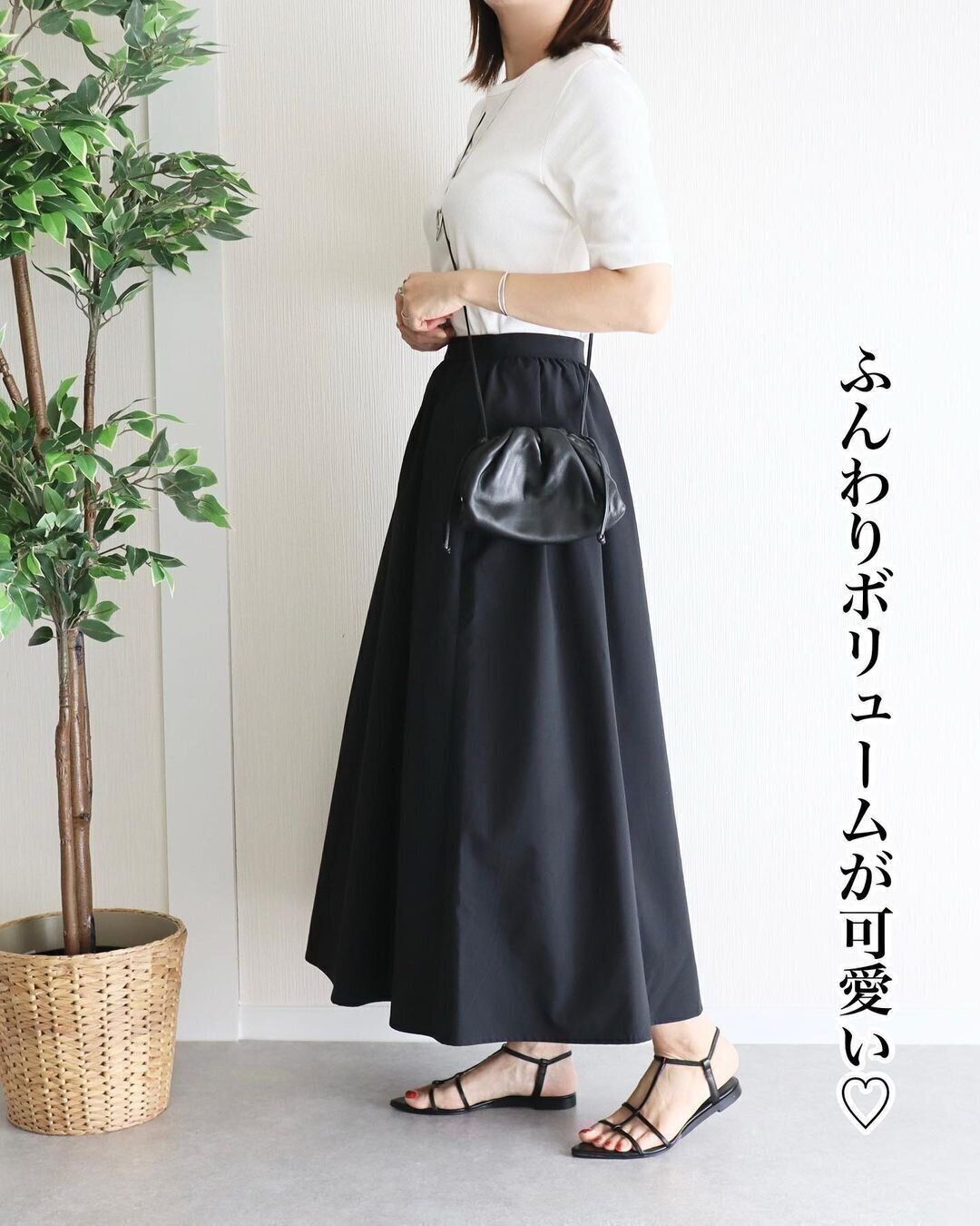 秋のドラマティックなムードを盛り上げてくれる「ボリュームロングスカート/3,990円」もマストバイ。ボリューム感を演出するハリ感がある素材が高見えします。晩夏はTシャツと合わせて、季節が進めばニットとコーディネートすることもできます。