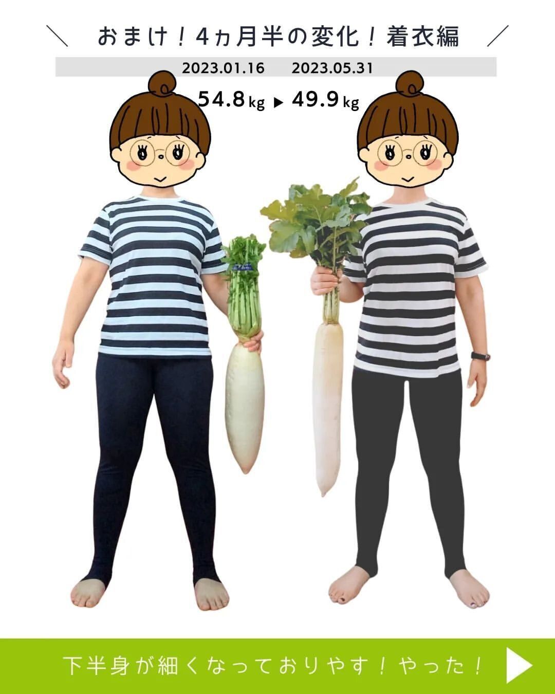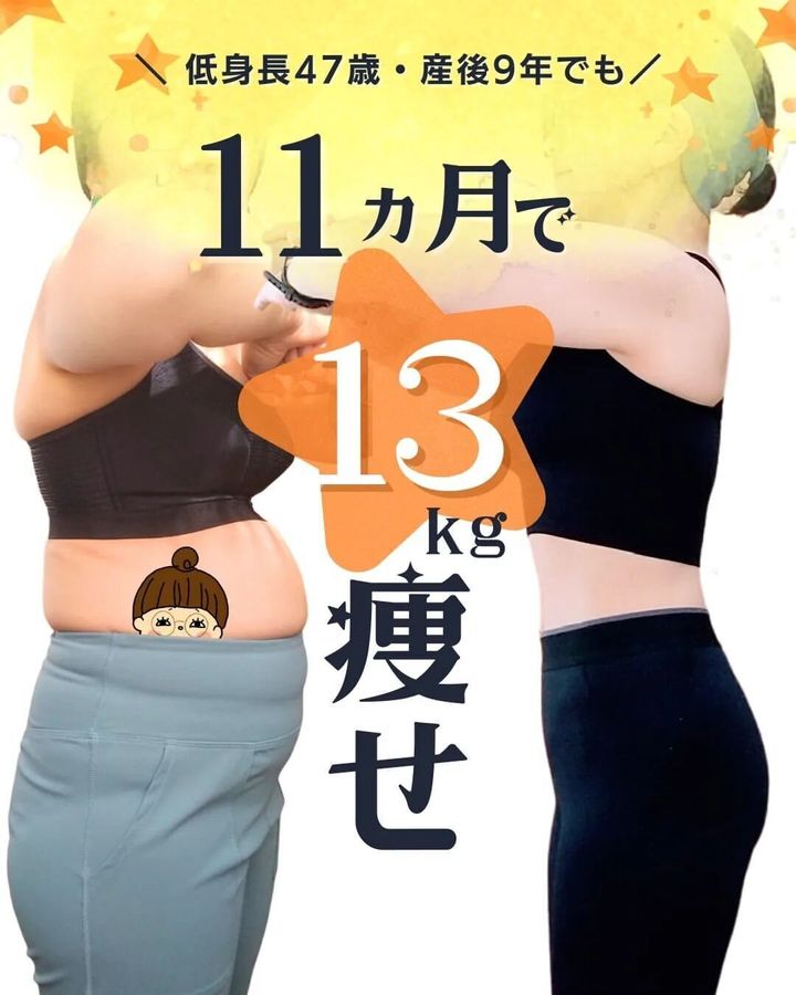 こちらが40代後半、ppurin_dietさんのビフォーアフターの写真。-13kgということで、体の薄さがまったく違いますよね。お尻もプリっと上がっているのがよくわかります。40代というと、年齢的なこともあり、昔のように痩せられないと感じている人も多いのでは?そんな世代でありながら、これほどの大きな変化に驚きです。