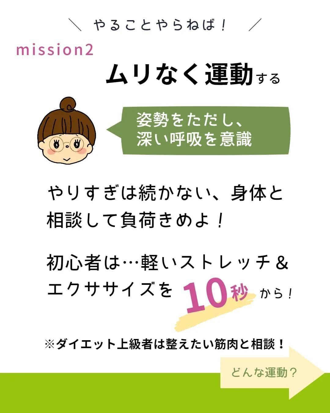 初心者は、軽いストレッチやエクササイズ10秒からでも始めてみましょうといいます。やりすぎは続きません。自分の体と相談しながら負荷を決めていきましょう。無理なく、継続できる範囲で運動することが大切です。