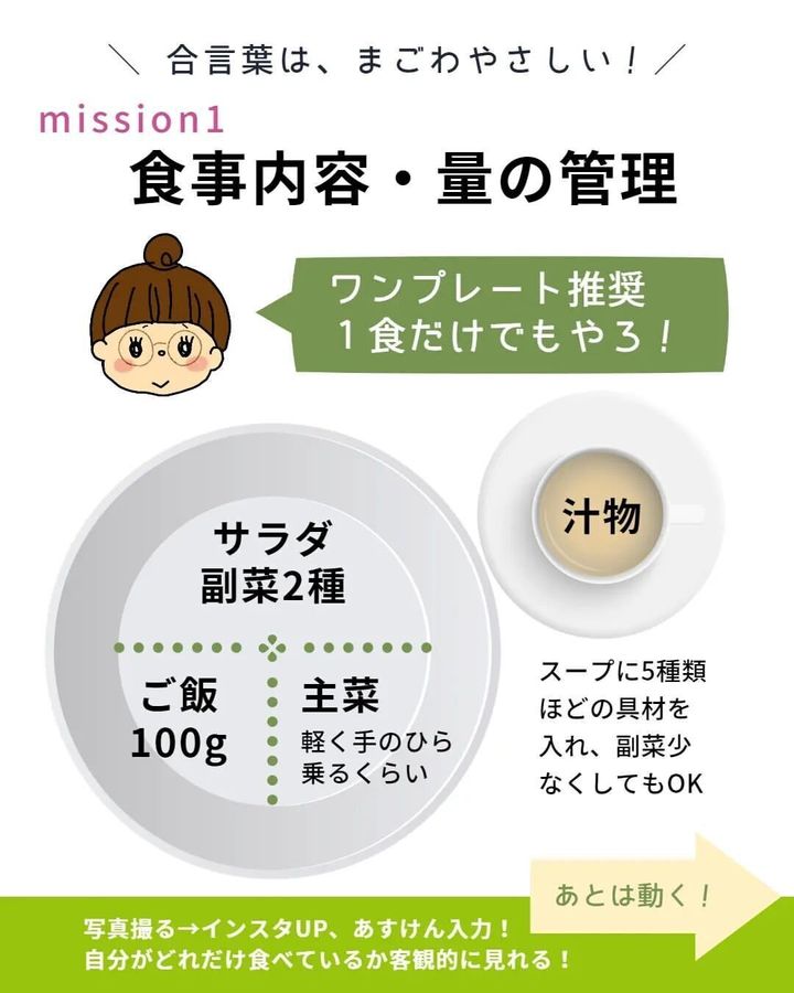 「ま(豆類)ご(ごま)わ(わかめ・海藻類)や(野菜類)さ(魚)し(しいたけ・キノコ類)い(イモ類)」を基本にした食生活を心がけながら、ワンプレートに盛ることで栄養バランスを把握しています。お皿のなかに、サラダ2に対して、ご飯1、主菜も1。それに汁物がついたスタイルです。今日の食事を写真に撮ると、自分の食べている量を客観的に見ることができるといいます。