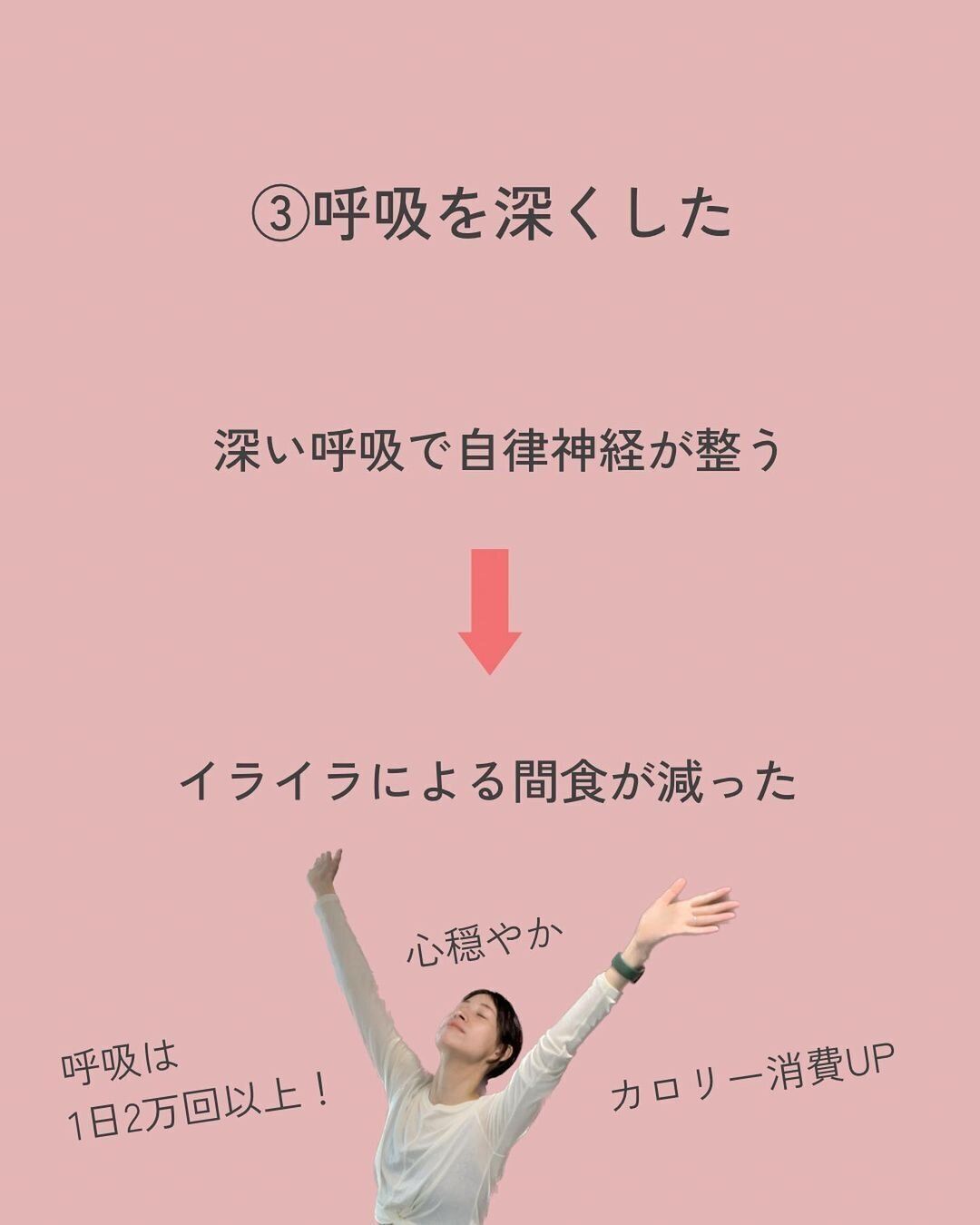 深い呼吸で自律神経は整い、イライラによる間食が減ったといいます。深い呼吸を心がけることで、心は穏やかに、カロリー消費もアップといいことばかり。