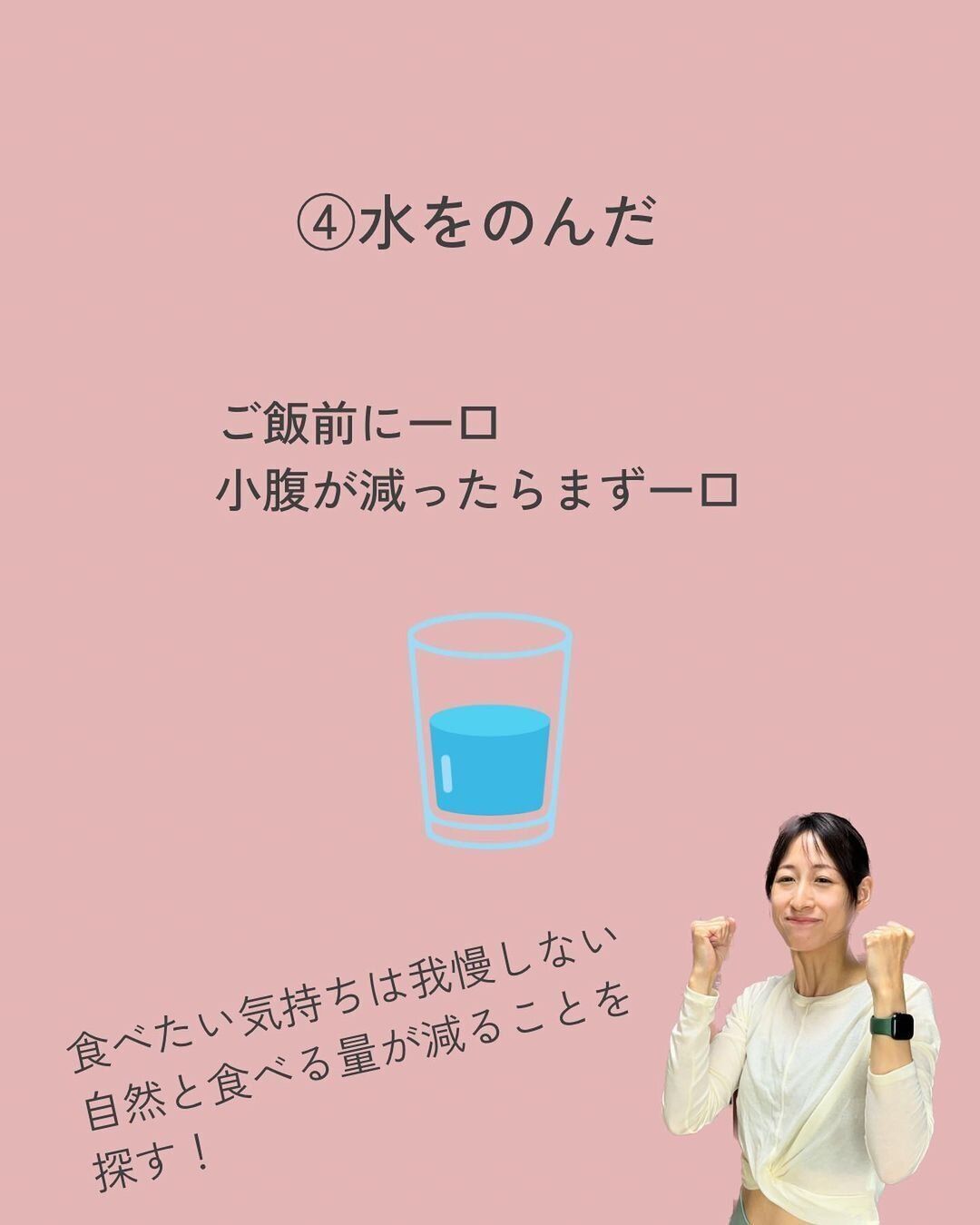 ごはんの前にひと口、小腹が減ったらひと口。口さびしくなると、水分をとる習慣を身につけました。食べたい気持ちは我慢せずに、自然と食べる量が減ることを探すといいのだそう。