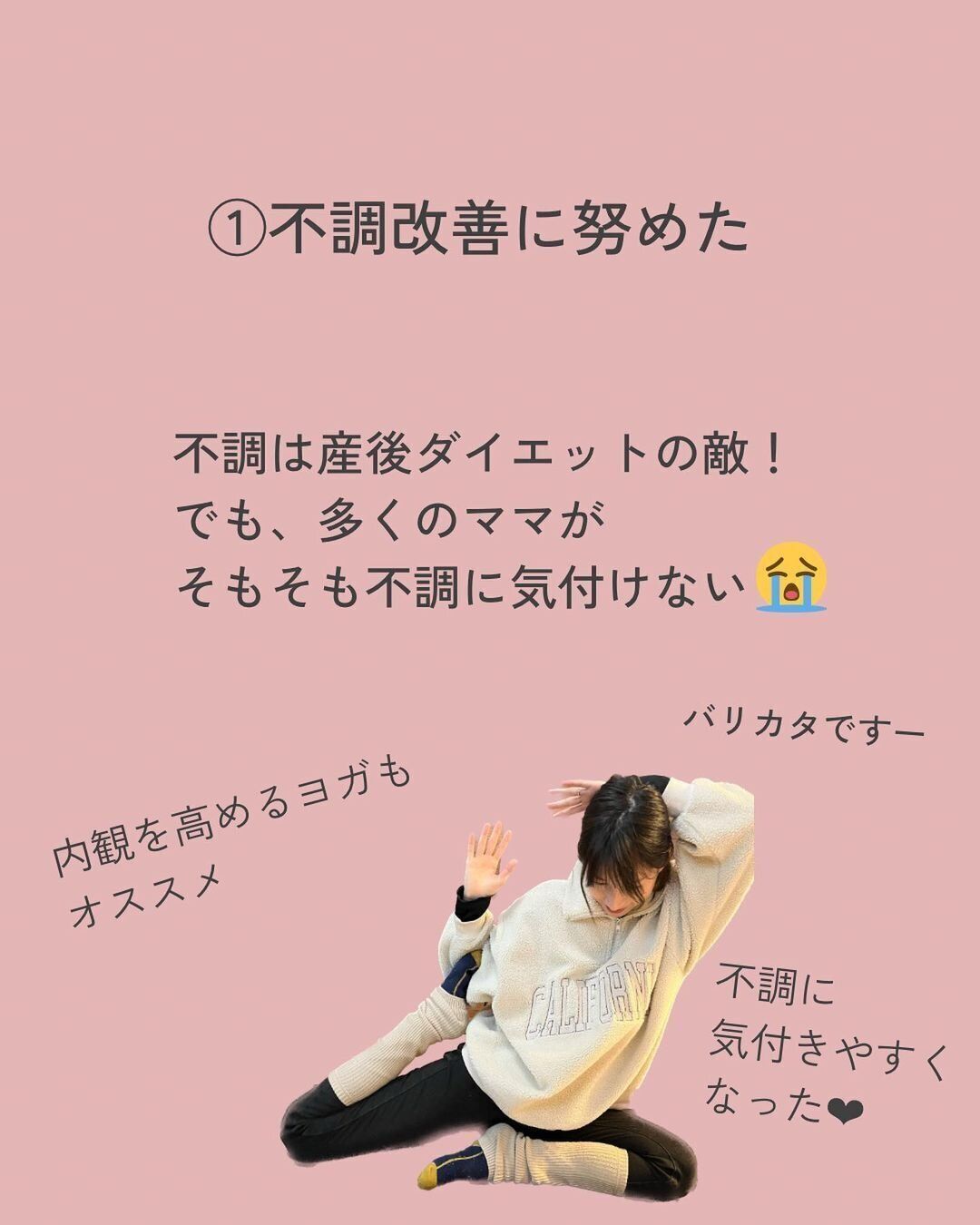 「体の不調は産後ダイエットの敵」といいます。いきなりダイエット食や運動に取り組むのではなく、まずは自分の体と向き合い、不調を改善することから。でも、自分の体のことを気づかう時間もないママたちにとって、不調に気づくこと自体、むずかしいですよね。kana_sango_さんは、ヨガにチャレンジ。内観を高めるので、不調にも気づきやすくおすすめなのだそう。