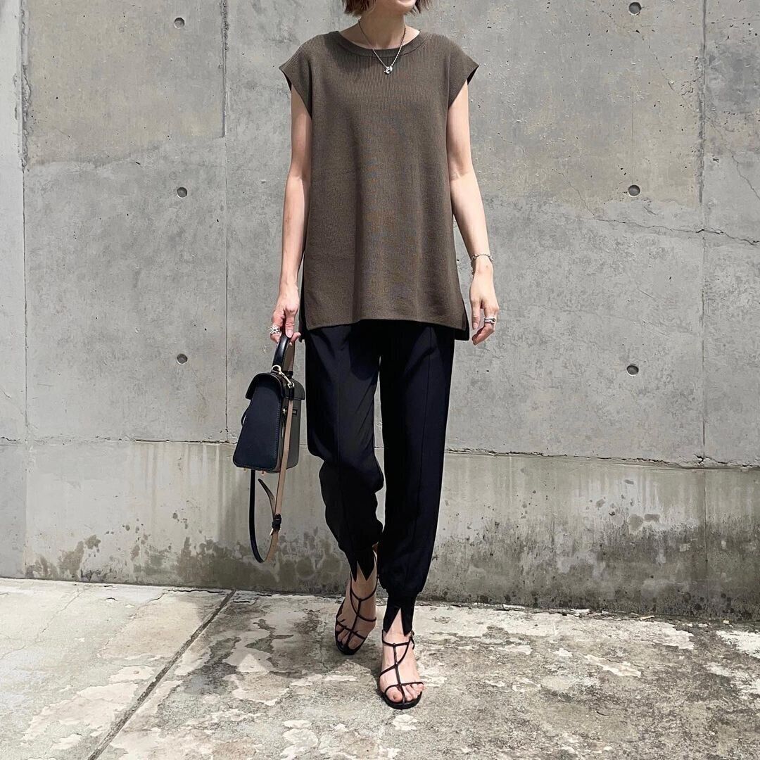 GUの「フレンチスリーブセーター/1,490円」は、二の腕の一番太い部分をきれいに隠してくれる体形カバーに強いトップス。さらにサイドにスリットが入っているので、横から見たシルエットもスラリ。シャリッとした肌触りなので、暑い日に着やすいのもポイントです。色は、秋映えするオリーブ色がイチオシ!