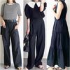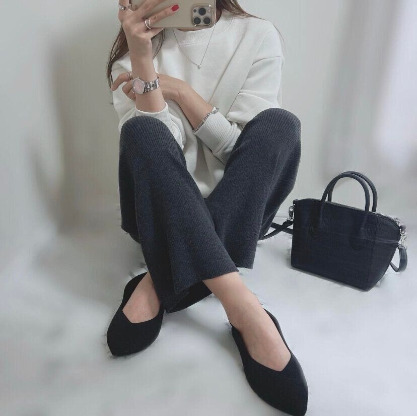 履き心地の楽さを優先するなら「ニットリブパンツ」(2,990円)がマスト。ゆったりとしているストレートシルエットですが、リブはこまかくきれいめな印象。アラフォー女性に人気の大人カジュアルコーディネートに大活躍してくれます。リラックスできるのにおしゃれなニットリブパンツは1本は持っておきたいボトムスですね。