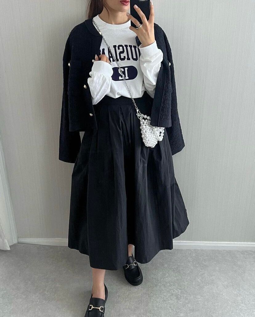 「ダブルポケットニットジャケット」はコンパクトなデザインなので、ボリュームのあるボトムスと合わせればメリハリのあるバランスの良いコーディネートが完成します。ロングスカートで気になる下半身をカバーしつつ、トップスは「ダブルポケットニットジャケット」できゅっとシメれば着やせ効果も期待できちゃいます。