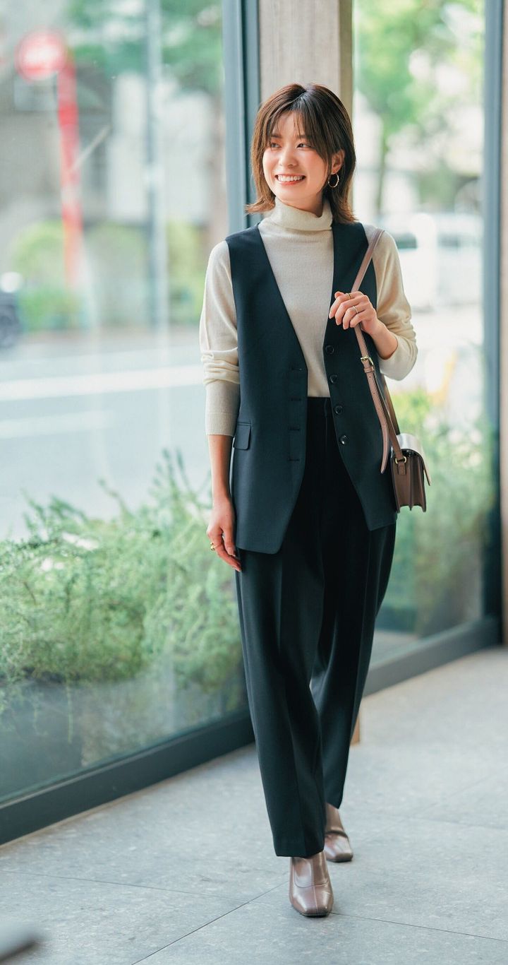 ジレは一見難しく見えるけど、一度着ちゃえば便利さ、スタイルアップの虜になるはず。秋冬はタートルネックと合わせると、なお細見え。