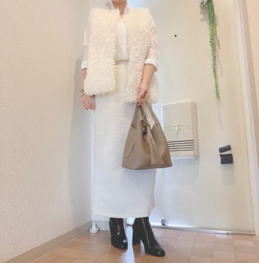 今季もトレンドのファーベストはボトムス選びにちょっぴり悩むアイテム。ヘビーウェイトスウェットナローロングスカートはすっきりとした印象のシルエットなので、ボリュームのあるファーベストとも相性抜群!