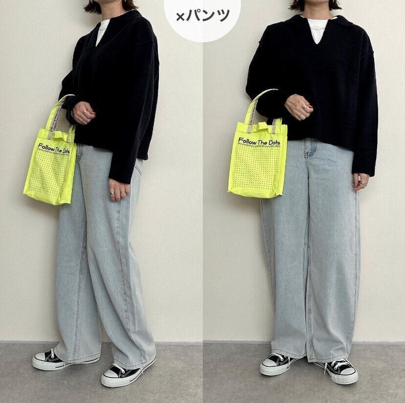 「パフィータッチ スキッパーポロセーター」(2,490円)は他のパフィータッチニットシリーズと比べると丈感も短くコンパクトな印象のニット。ルーズなボトムスと合わせても、メリハリのあるバランスの良いコーディネートが完成します。目線がやや上に行くので下半身にコンプレックスのある人に特におすすめです。