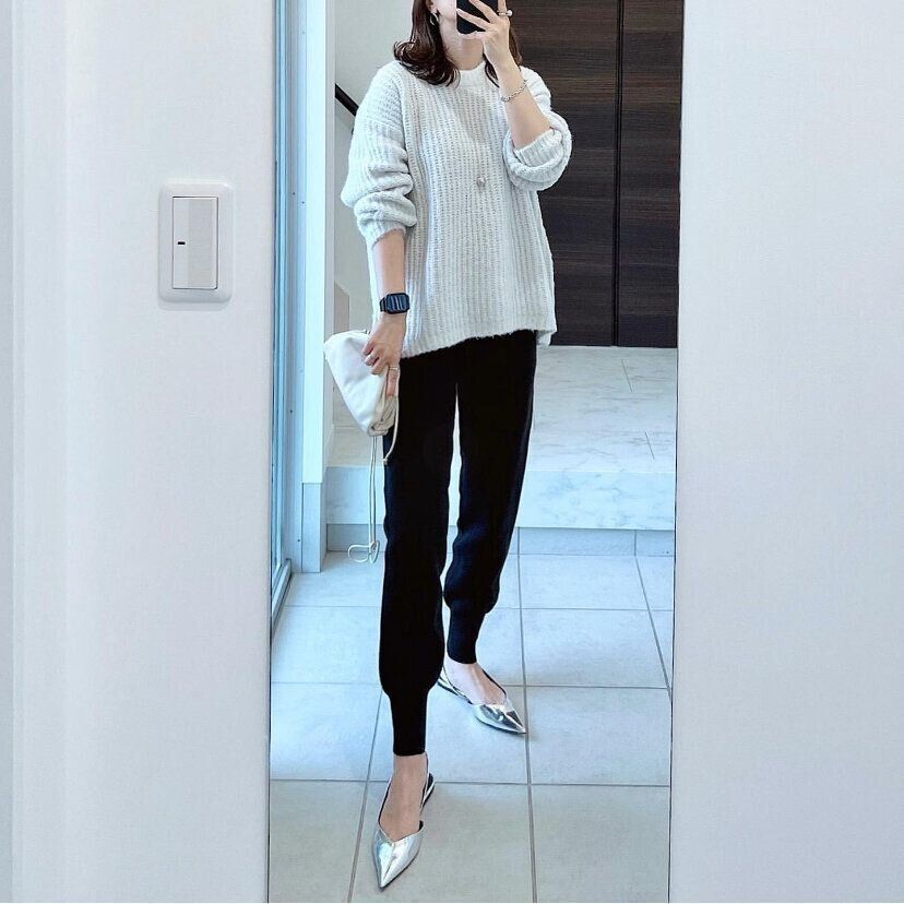 今シーズン1枚は持っておきたい「パフィータッチローゲージクルーネックセーター」(2,990円)はややオーバーサイズなので体型をひろわず、着やせ効果も期待できるアラフォー女性にうれしいニット。軽やかなニットなので、着心地も抜群と大人気!ジョガーパンツにパフィータッチローゲージクルーネックセーターを合わせることでカジュアルすぎないお出かけスタイルが完成します。