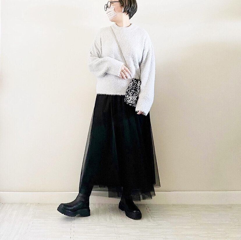 今シーズン様々なブランドから発売されているチュールスカートは、トップスの選び方によって着ぶくれしてしまう可能性もあるアイテムですが、「シャイニークルーネックセーター」は短めの丈感でコンパクトにまとまったデザインなので、メリハリのある着やせコーディネートが完成します。プリーツスカートとも相性◎!