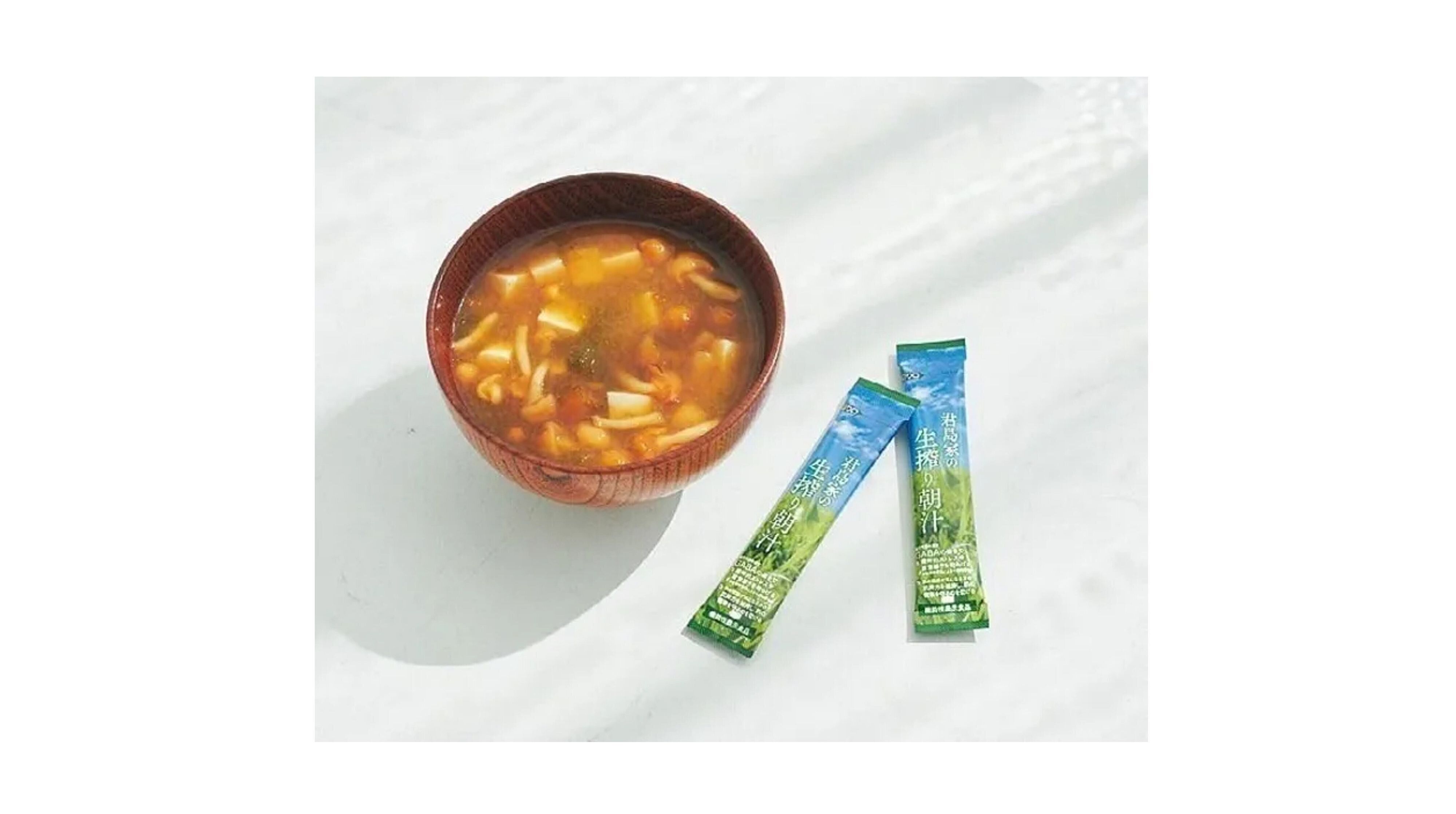 「温かい物と塩分で体が目覚めるのでみそ汁は欠かしません。食物繊維とたんぱく質を取れるよう具だくさんにしてエネルギーをチャージ。疲れを感じたら自社開発の青汁を水に溶かして飲むと血色がよくなるのを感じます」。