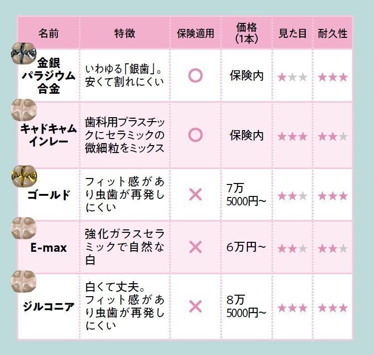 保険適用の銀歯は、接着剤の耐用年数が6~8年。接着剤の劣化部分には虫歯が再発しやすく、治療が必要に。長い目で見れば、値段は高くても長持ちするジルコニアやゴールドがおすすめ。