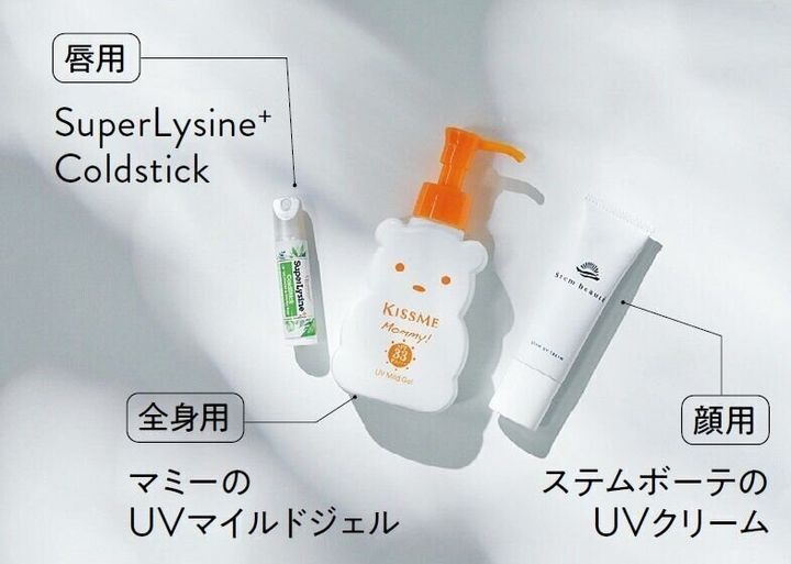「リップはSPF21で、ハーブやアミノ酸配合で荒れ防止にも。iHerb(アイハーブ)で購入してます。全身用は子どもと共用できる物を。バッグに常備してまめに塗り直します。顔用は今話題の美容成分・幹細胞入りでエイジングケアを意識」。