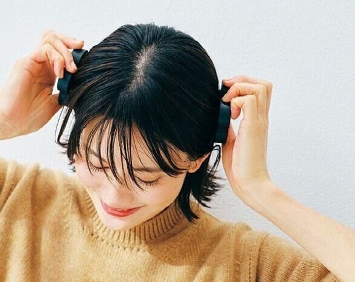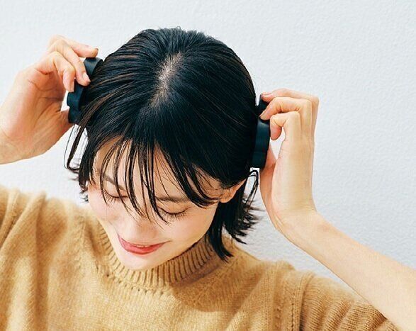 顔のリフトアップや美髪キープのため、シャンプー時にスカルプブラシで頭皮をクルクルマッサージ。「両手使いなら1分で頭全体をほぐせてスッキリ」。