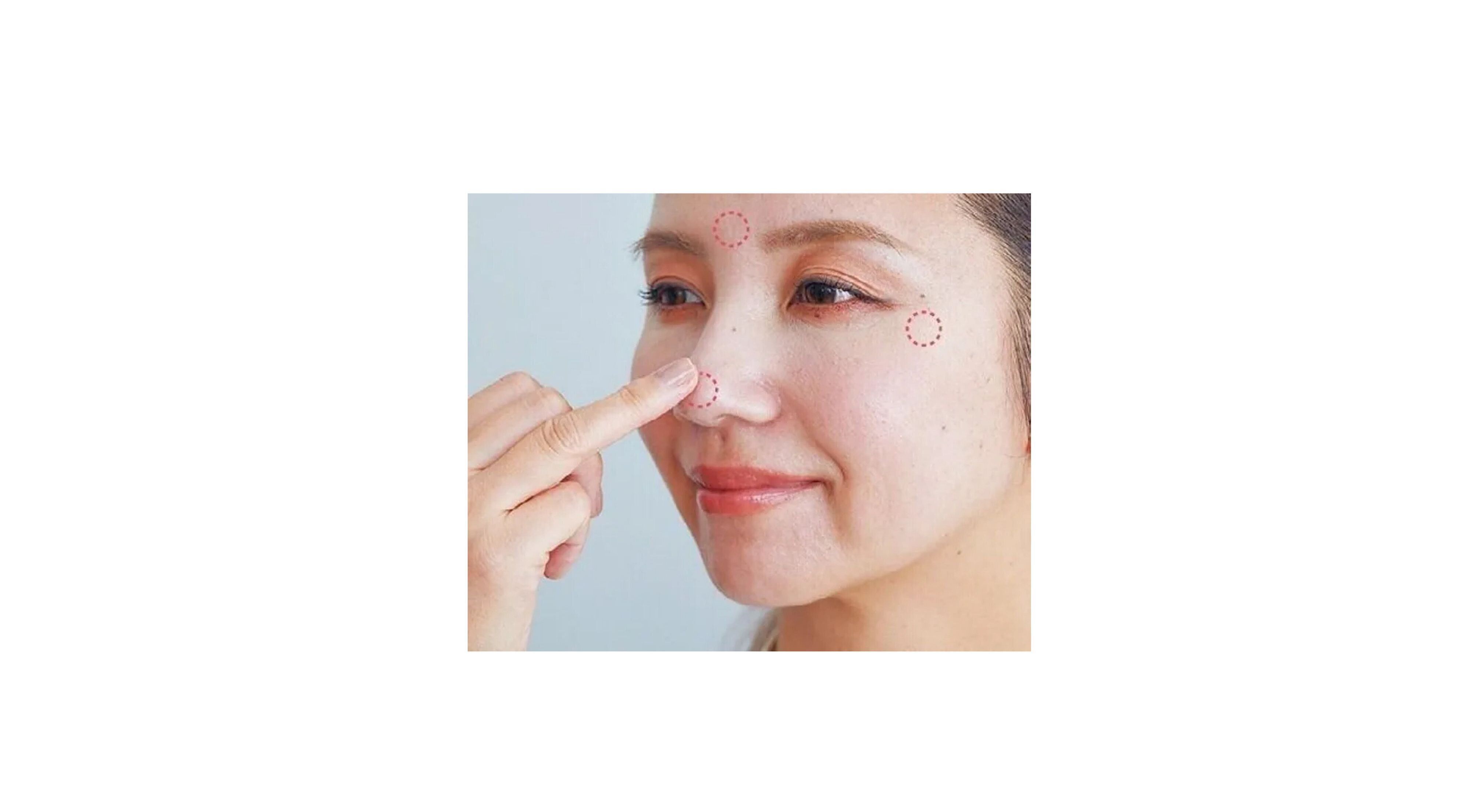 指で押さえるように、眉間、鼻先、こめかみにBをのせる。