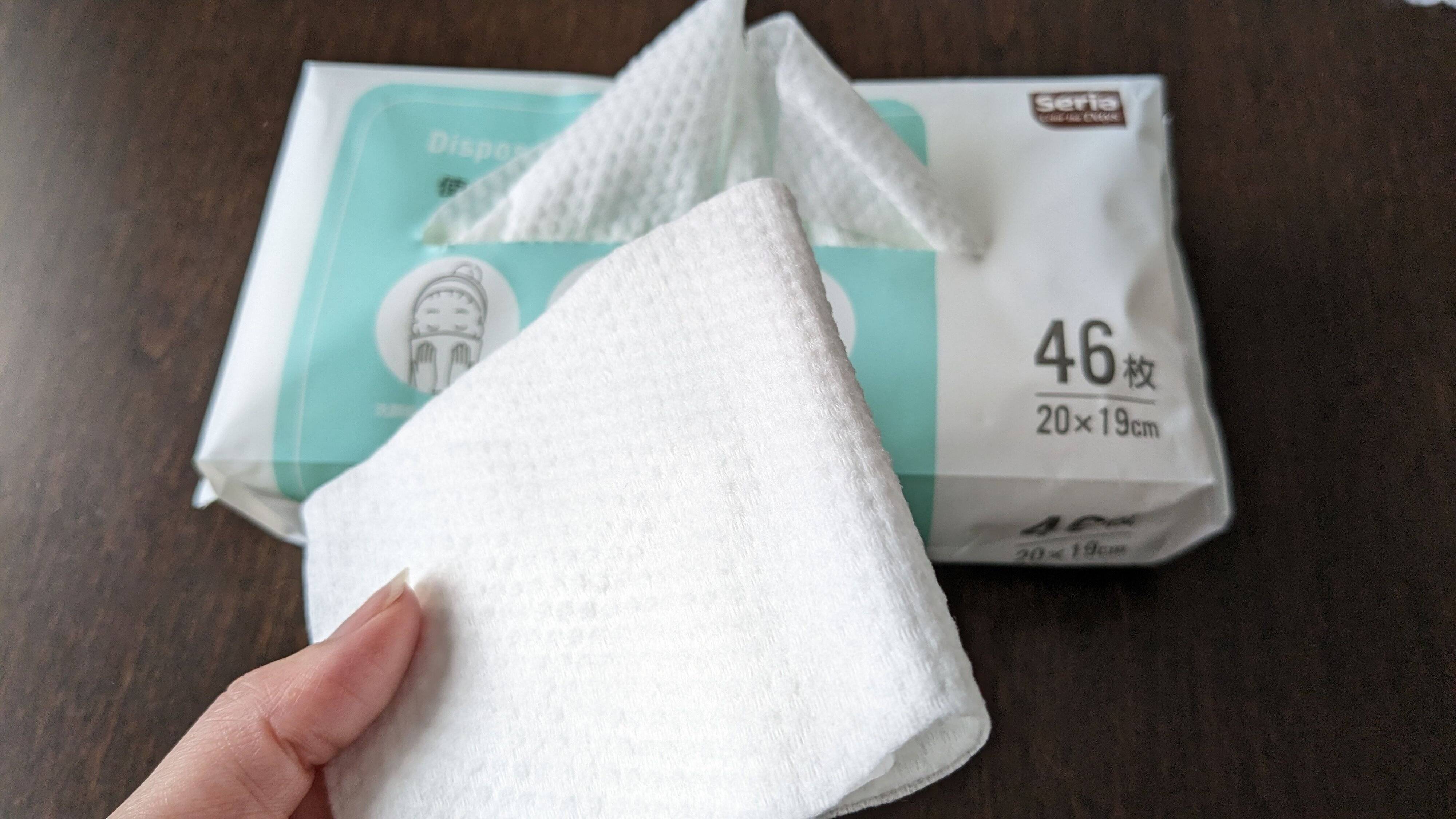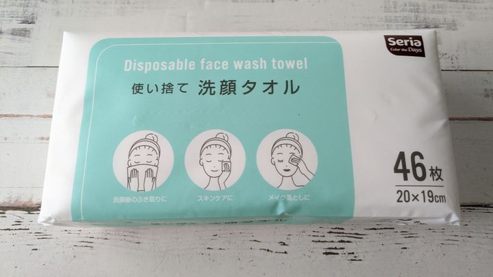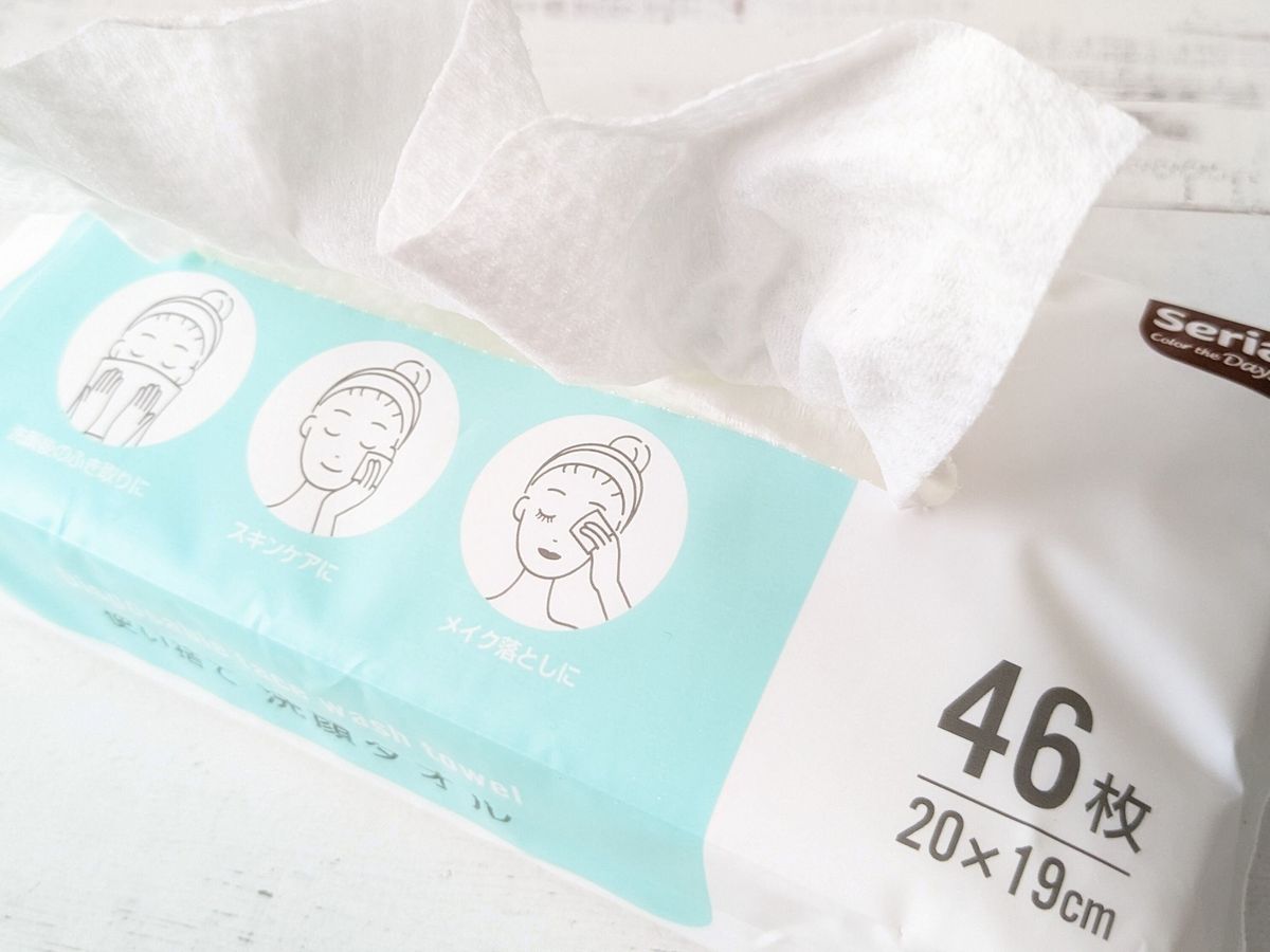 大手の製紙メーカーも使い捨て洗顔タオルを出していますが、セリアだと46枚入りで110円なので、ちょっと試してみたいという方にもおすすめです。