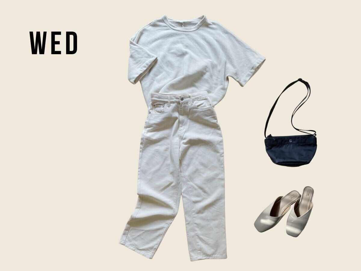 白い五分袖Tと白いデニムパンツを合わせたカジュアルコーデ。