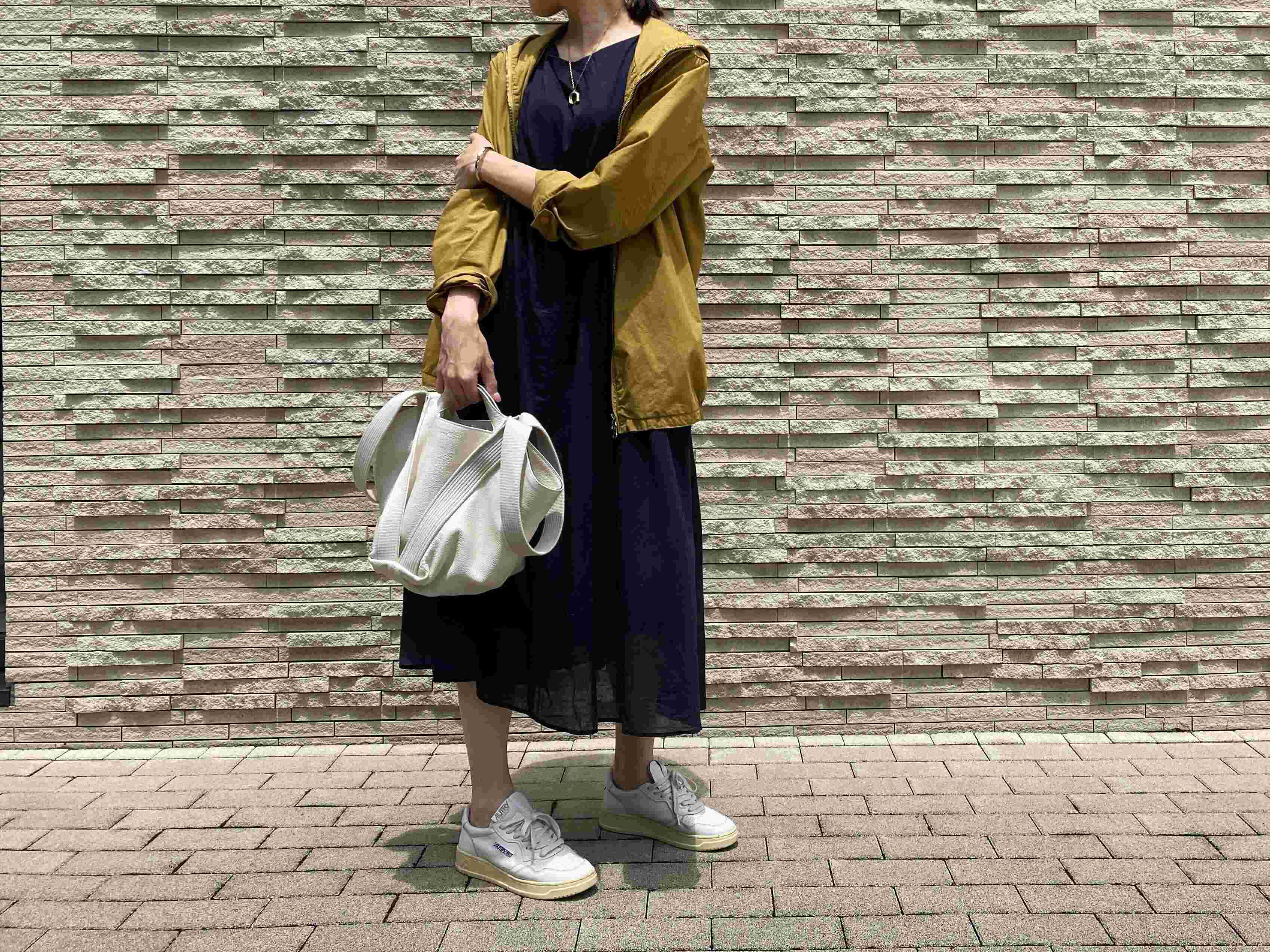 ご紹介するなかで、一番強い雨が降っても安心なスタイルがこちら。スニーカーがレザーライクなもの、かつ厚底になっているため、雨水がスニーカーに染み込んでいく心配がありません。アウターは、雨水が染み込んでいくスピードがゆっくりなシャカシャカとした素材のものだと安心。撥水加工のものを選んでもいいですね。ノースリーブのワンピースに合わせれば、身体のなかに熱がこもってムシムシとした感じもなくなります。ワンピースやスカートだと、雨水が多少当たっても気にならない点も優秀です。