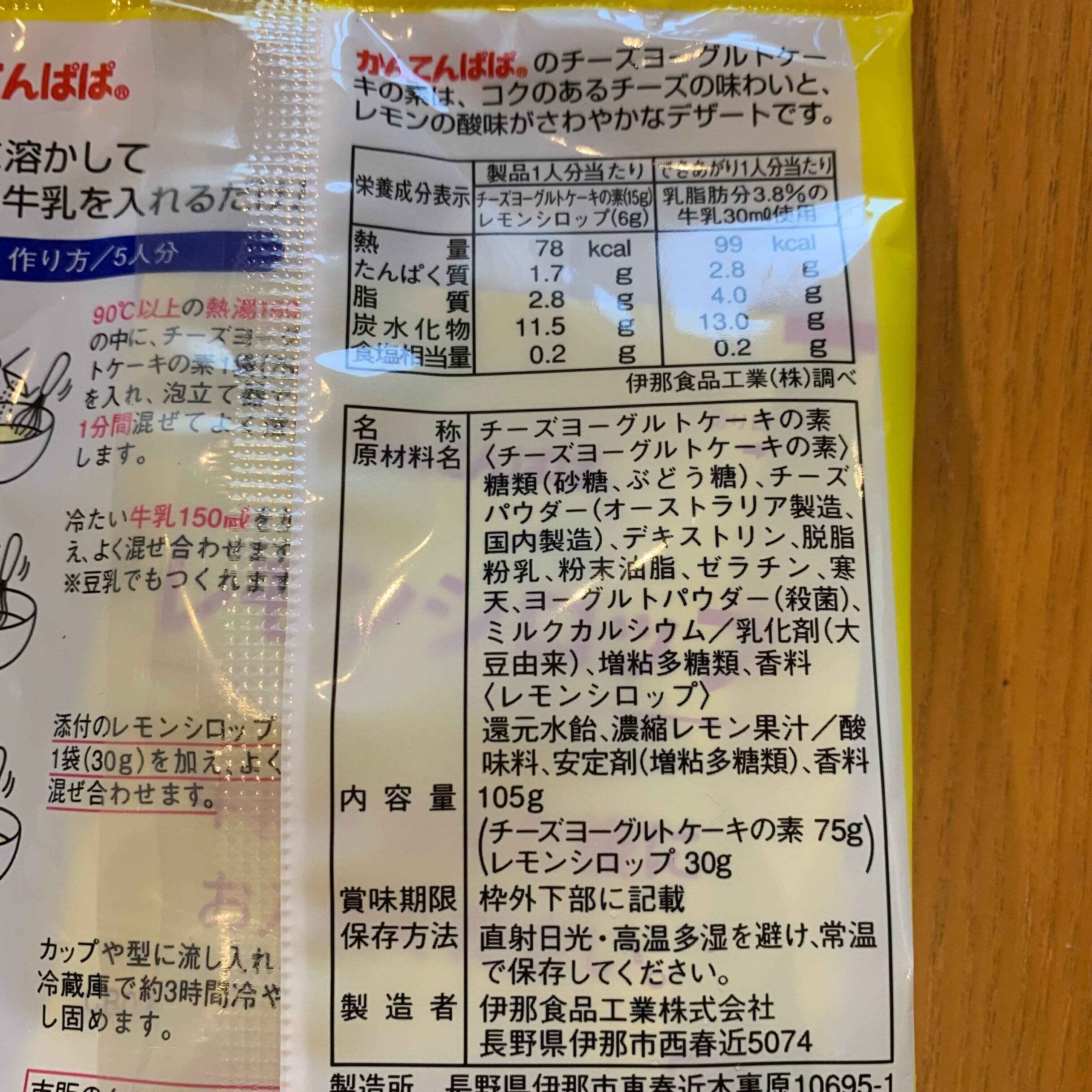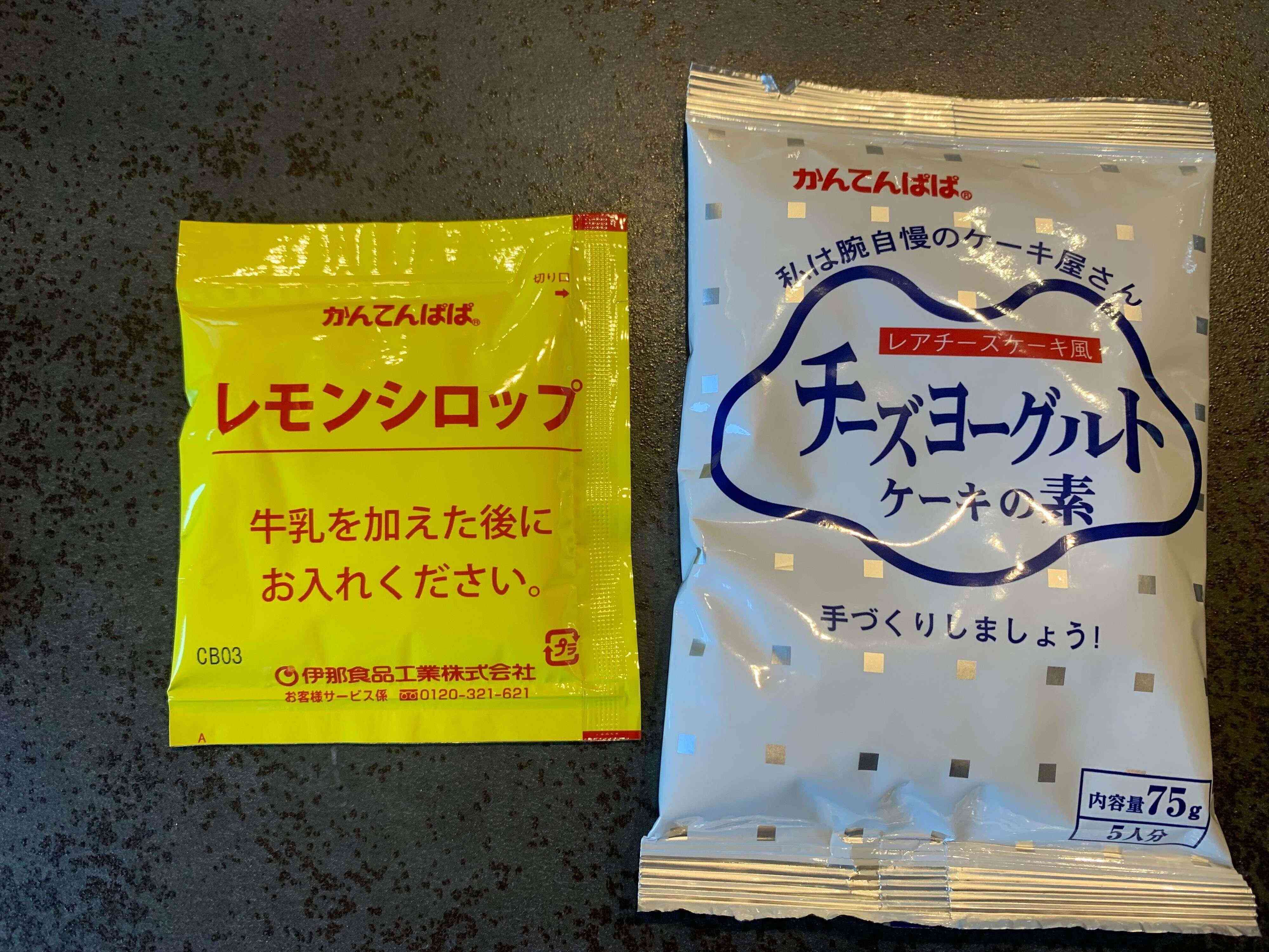 袋の中身はとてもシンプルで、チーズヨーグルトケーキの素とレモンシロップのみ。