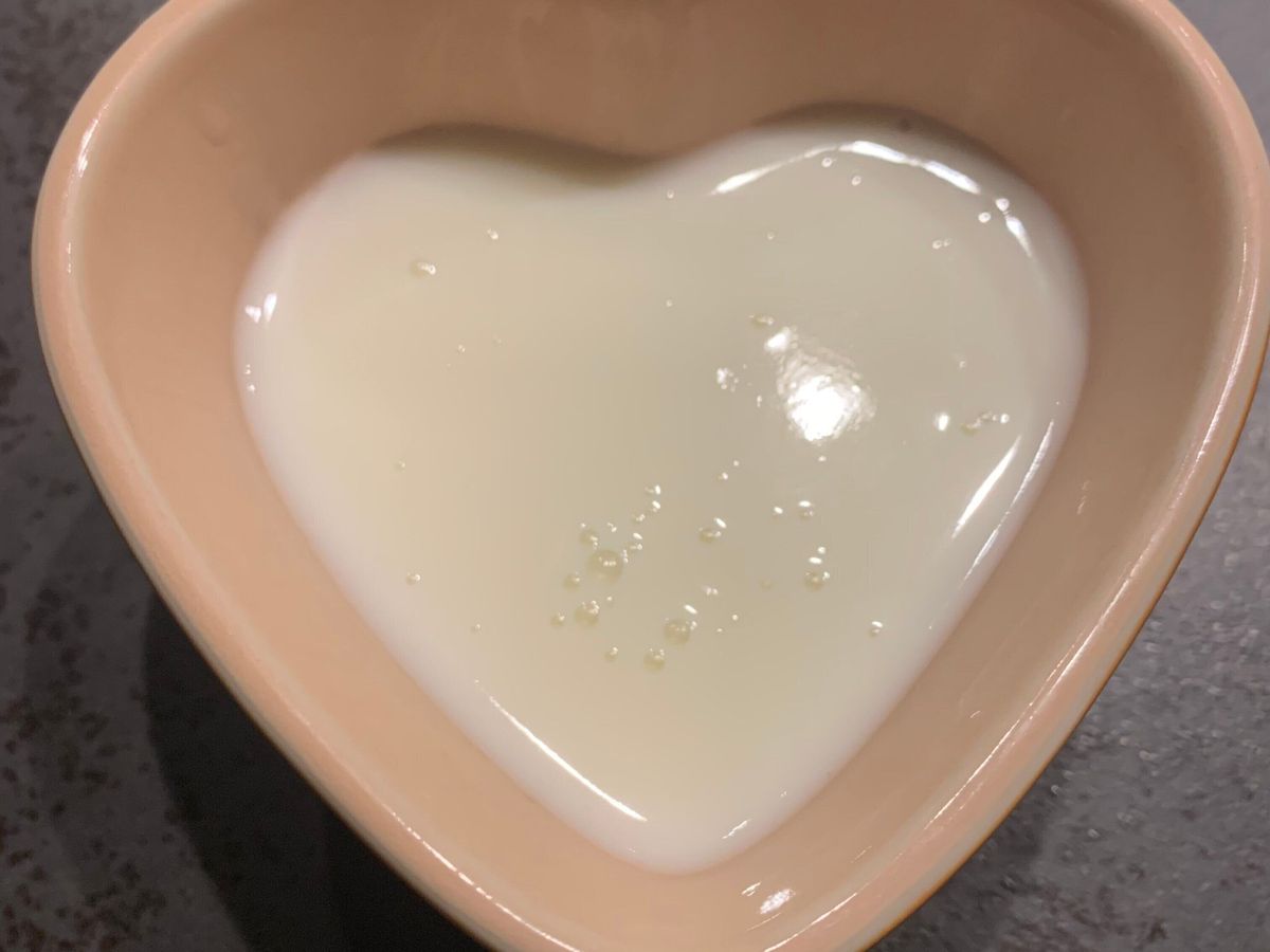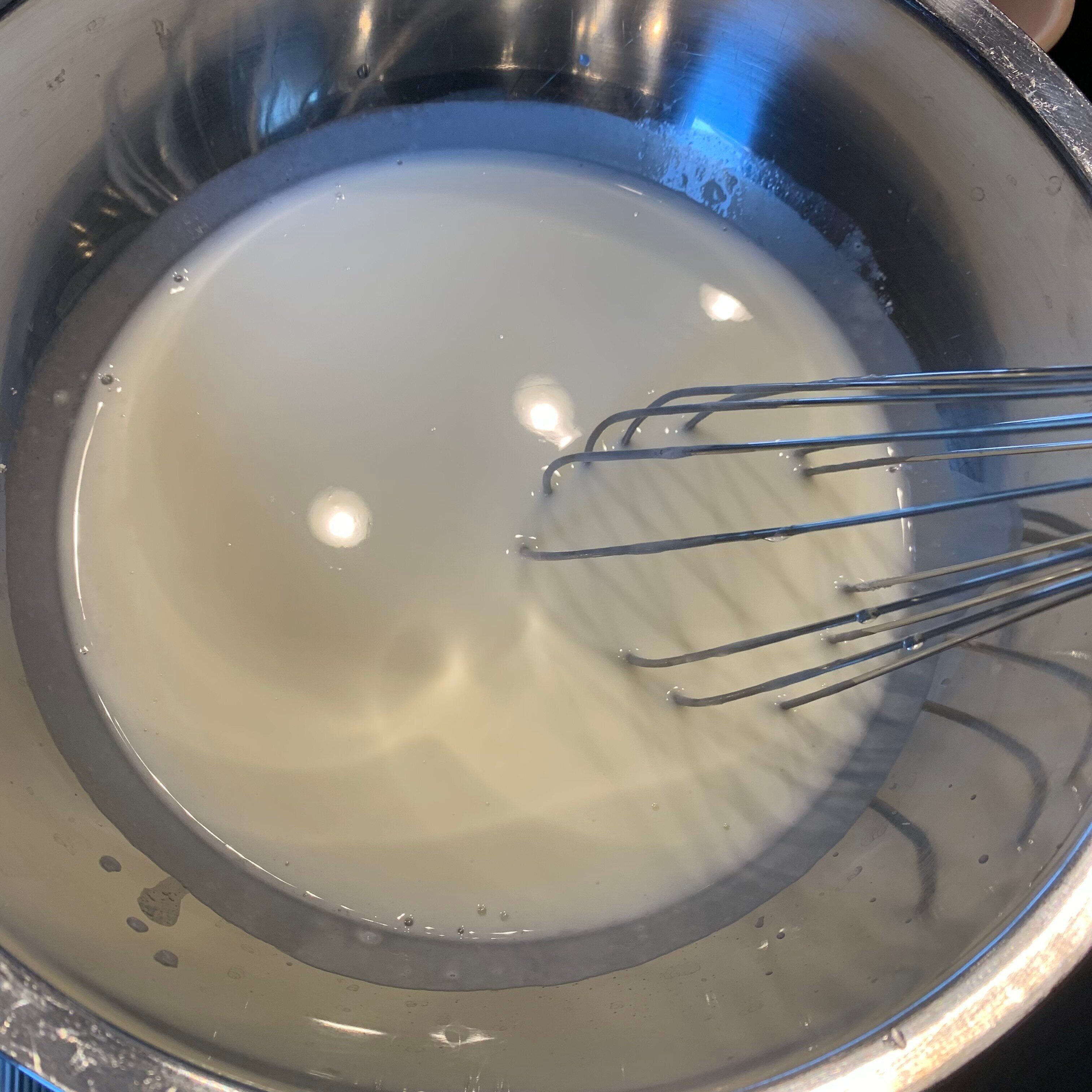 素に牛乳を加えて、混ぜ、さらにレモンシロップを加えてひたすら混ぜます。
