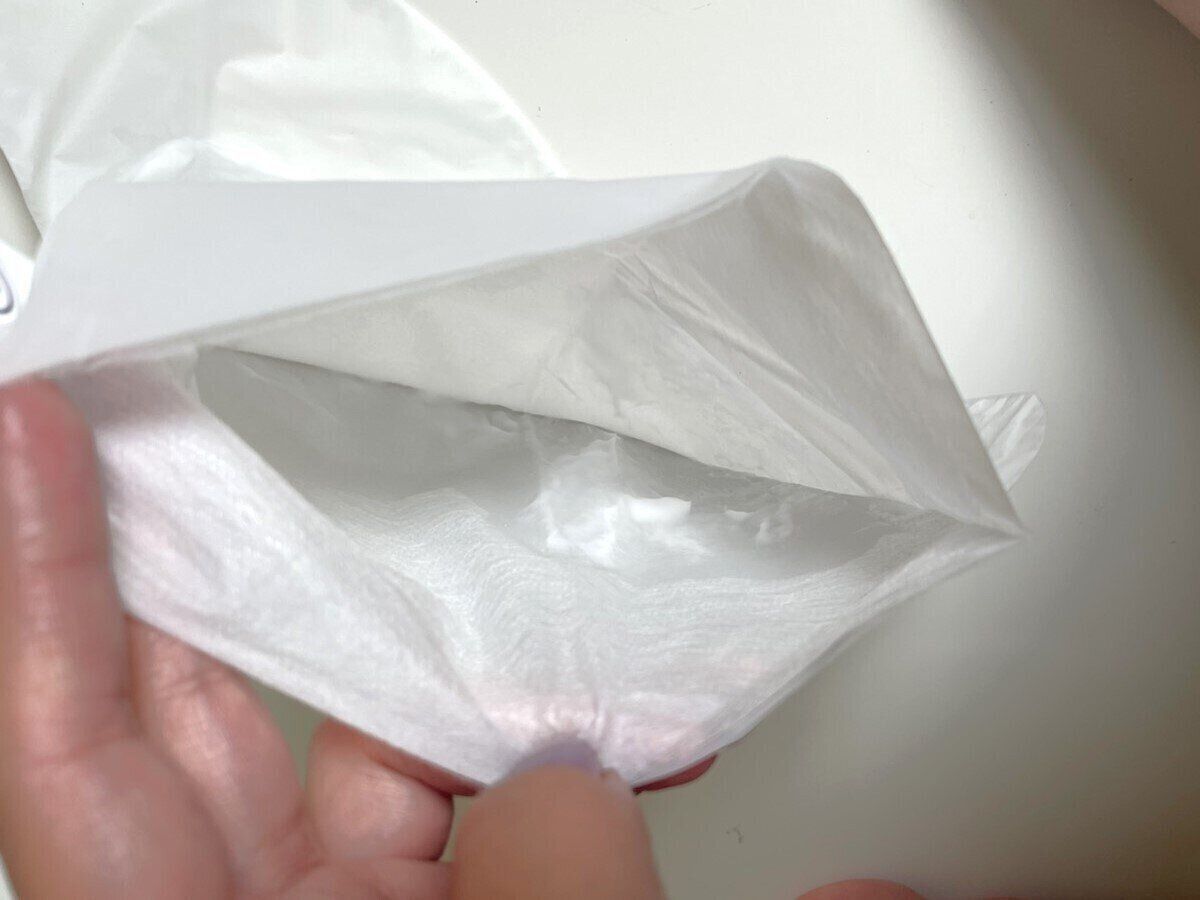 中には左右のフットマスクがミシン目で繋がったものが1枚入っていました。
