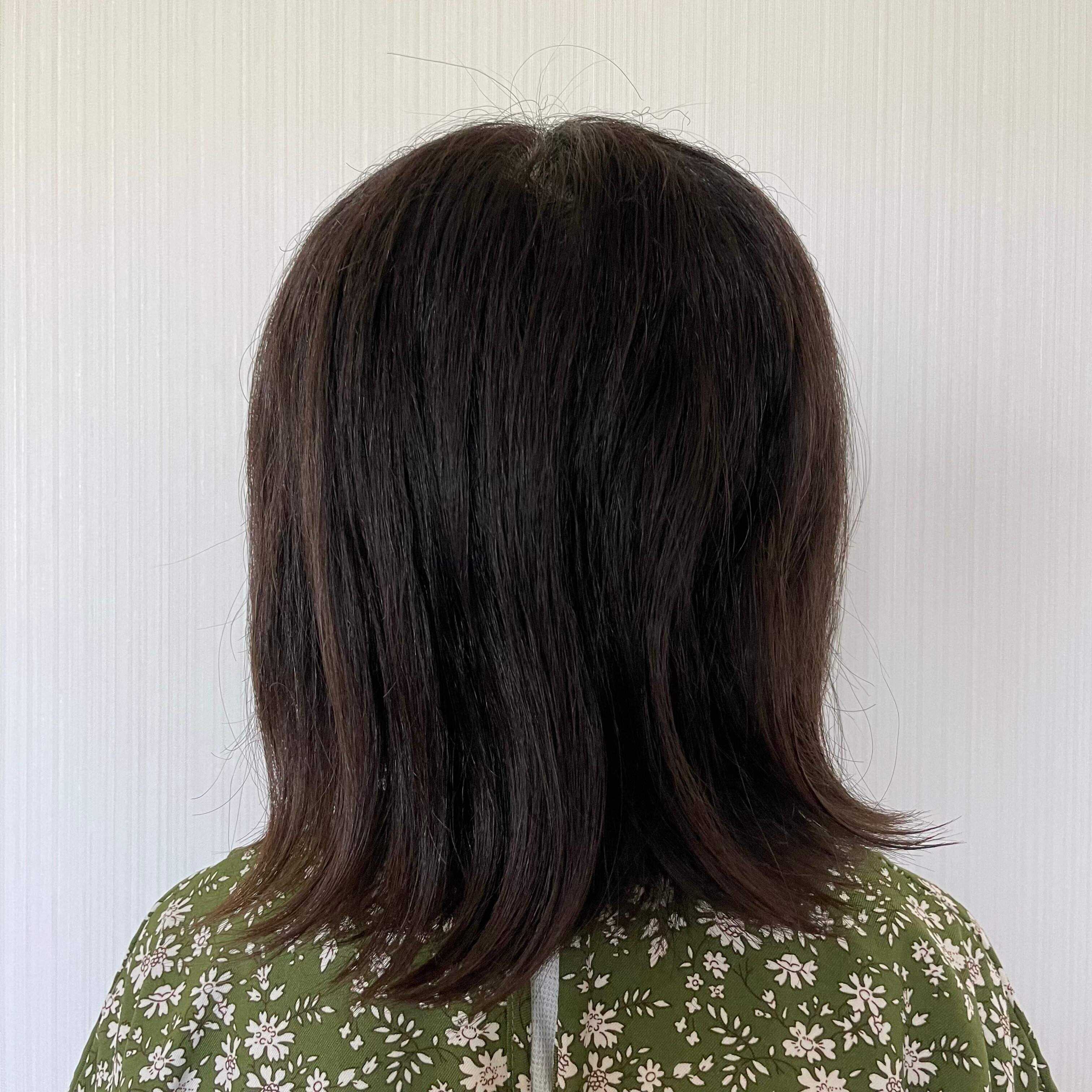 毛先はハネたままですが、中間のうねりは気にならないレベルにまで改善されました。ただ、時間が経つと再び広がるときもあったので、根本的な髪質改善とまではいかない様子です。それでも、トリートメントの効果としては十分だと感じられました。